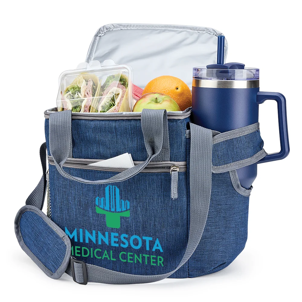 Personalized Lunch/Cooler Bag: Dual-zip, insulated main compartment keeps contents colder (or warmer) longer; Mesh pocket inside lid; Front zip pocket stashes napkins and other items; Side mesh pocket for a water bottle, utensils, and more; Additional adjustable side pocket totes up to a 30-/40-oz. bottle or tumbler; Two carry options: comfort-wrapped handles or padded, adjustable shoulder strap; Holds up to 9 cans; ID window on back; Heathered 600-denier polyester