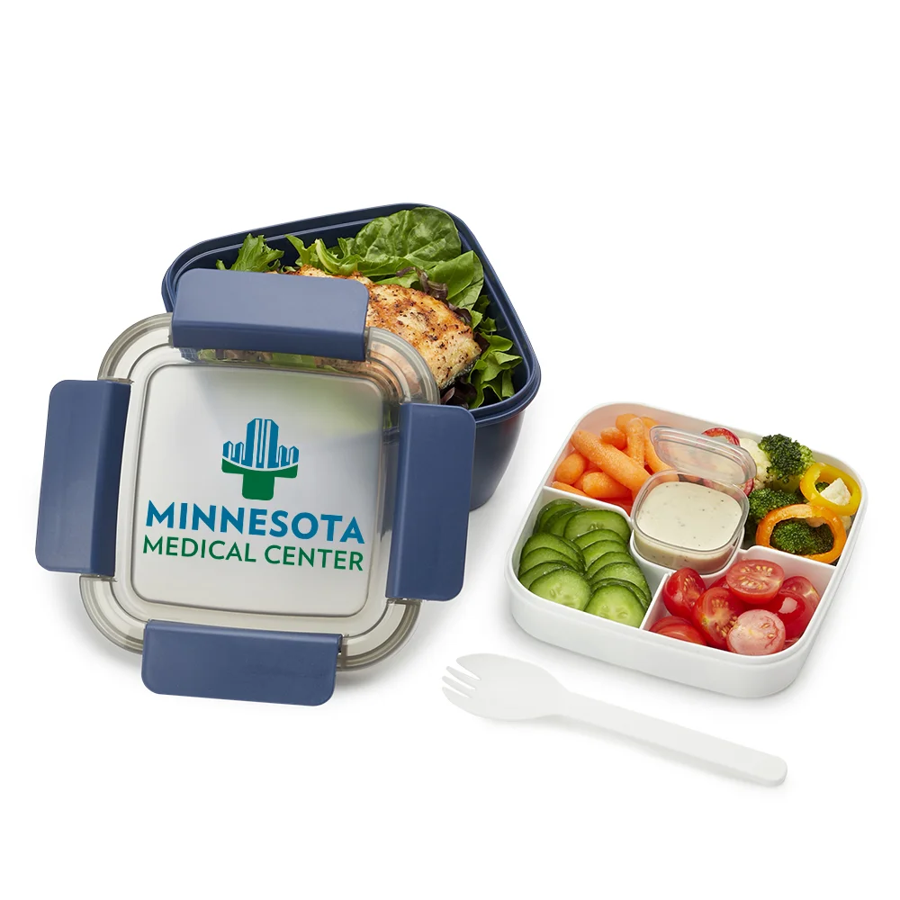 Personalized Food Container: Travel-friendly food container keeps entire meal fresh and organized; Plastic and silicone construction with hinged locking tabs creates an airtight, spill-resistant lid; Entree-sized bottom compartment holds 54 oz. (6.75 cups); Multi-compartment tray separates fruits, veggies, and sides; Sits on top of large compartment; Removable, lidded container in center holds 3 oz. of toppings, dips, or dressing; Included reusable fork tucks neatly inside; Eco friendly; BPA free; Note: Freezer, microwave, and dishwasher safe