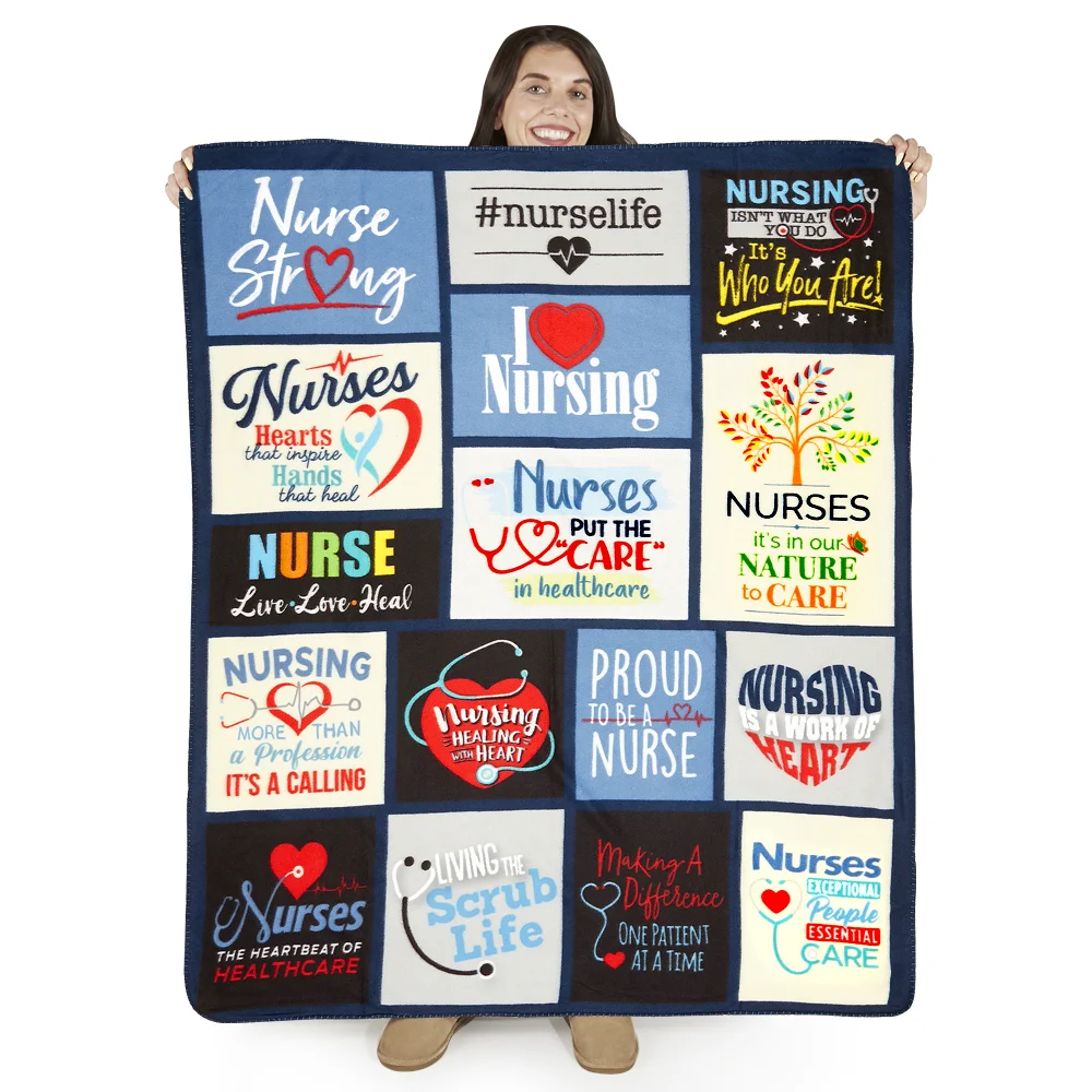 • Blanket features a patchwork of 16 inspiring messages for nurses