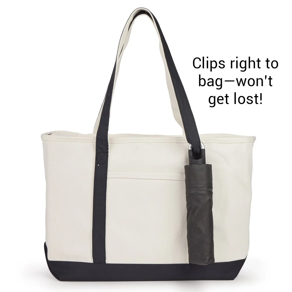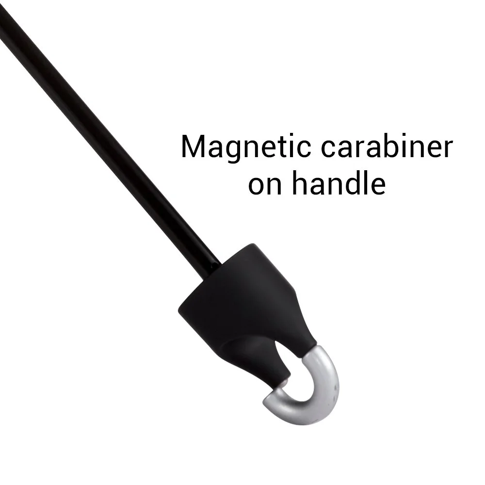 • Compact umbrella with magnetic-closure carabiner clips to any bag for amazing "there-when-they-need-it" convenience