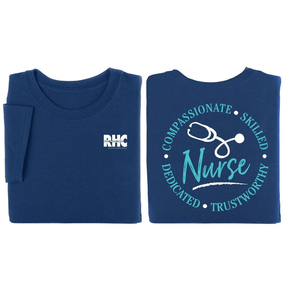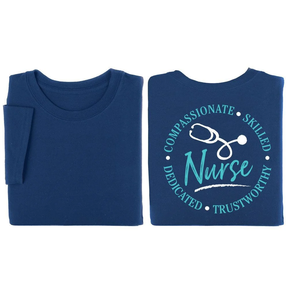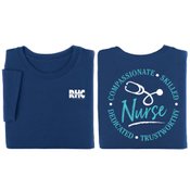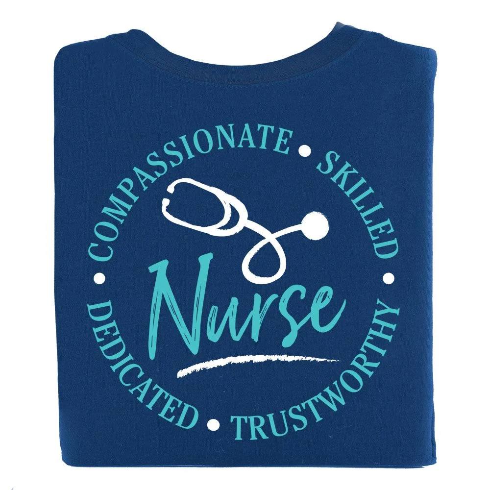 Features our exclusive Nurse: Compassionate, Skilled, Dedicated, Trustworthy design on back AND your screenprinted personalization on front upper left chest