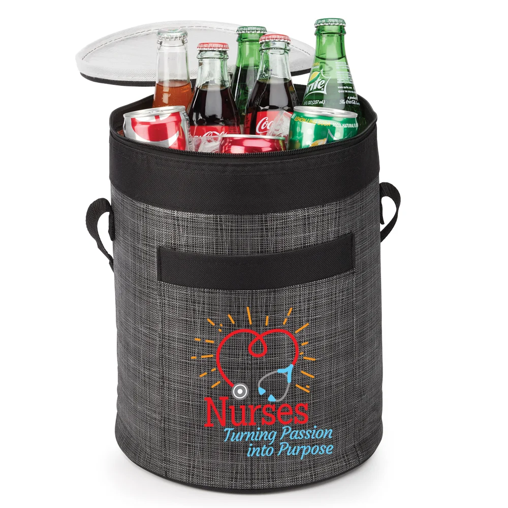 Brookville Barrel Cooler Bag: Zips shut; Insulated; Holds up to 16 cans plus ice; Exterior pocket; 19 1/2" carry strap; Folds flat for storage; 80-gsm. non-woven polypropylene/600-denier polyester trim