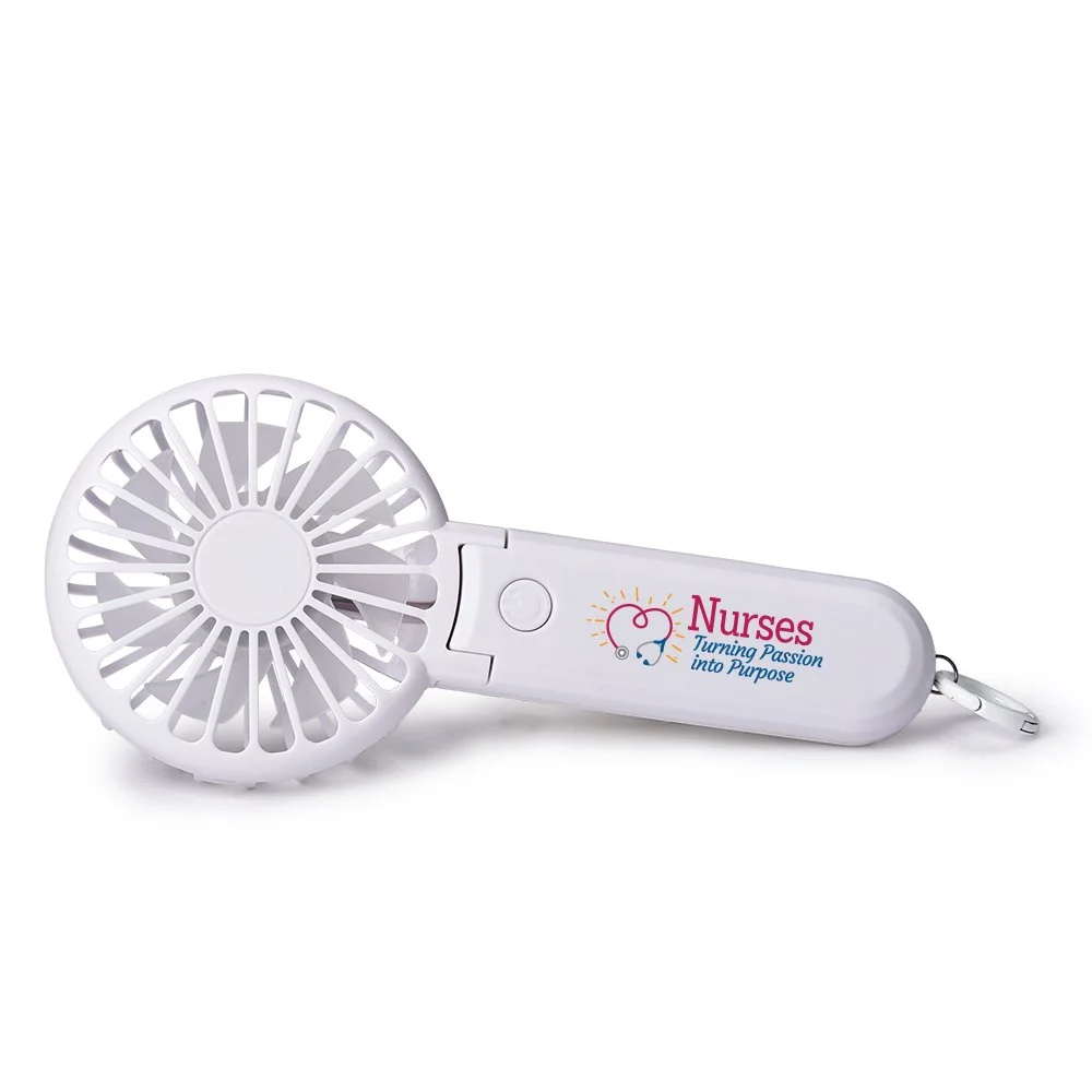 2-in-1 3-Speed Rechargeable Hand & Desk Fan: 3 speeds for custom cooling; Adjusts to any angle; Clip to laptop screen or attach to belt loop with easy-carry carabiner; Rechargeable; Up to 2-3 hours of cooling on a single charge; Charging time: 1.5 hours; Type-C USB charging cord and instructions included