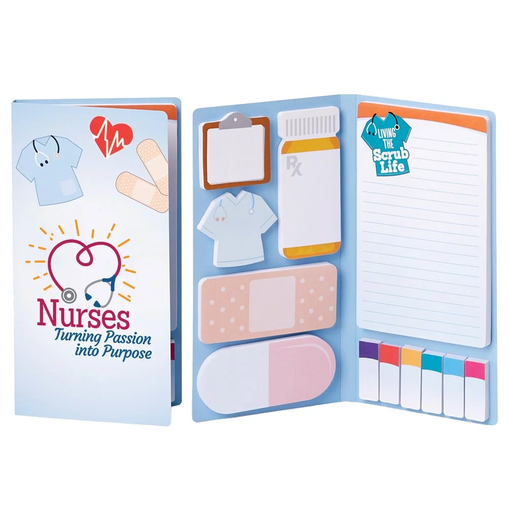 Sticky Note Gift Set: Protective padfolio cover opens to reveal sticky notes, flags, and pads in assorted shapes and sizes; Includes 6 healthcare designs & 6 color-coded flags, each with 50 sheets; 600 sheets total