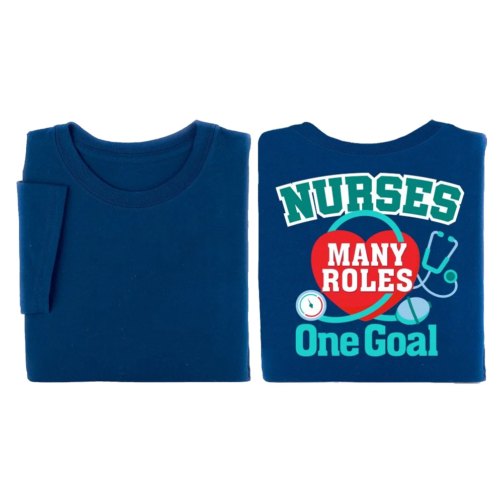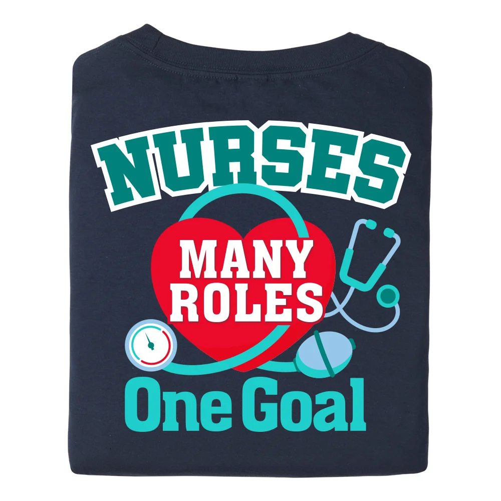 Nurses: Many Roles, One Goal Unisex 2-Sided Short-Sleeved T-Shirt - Silkscreened Personalization Available