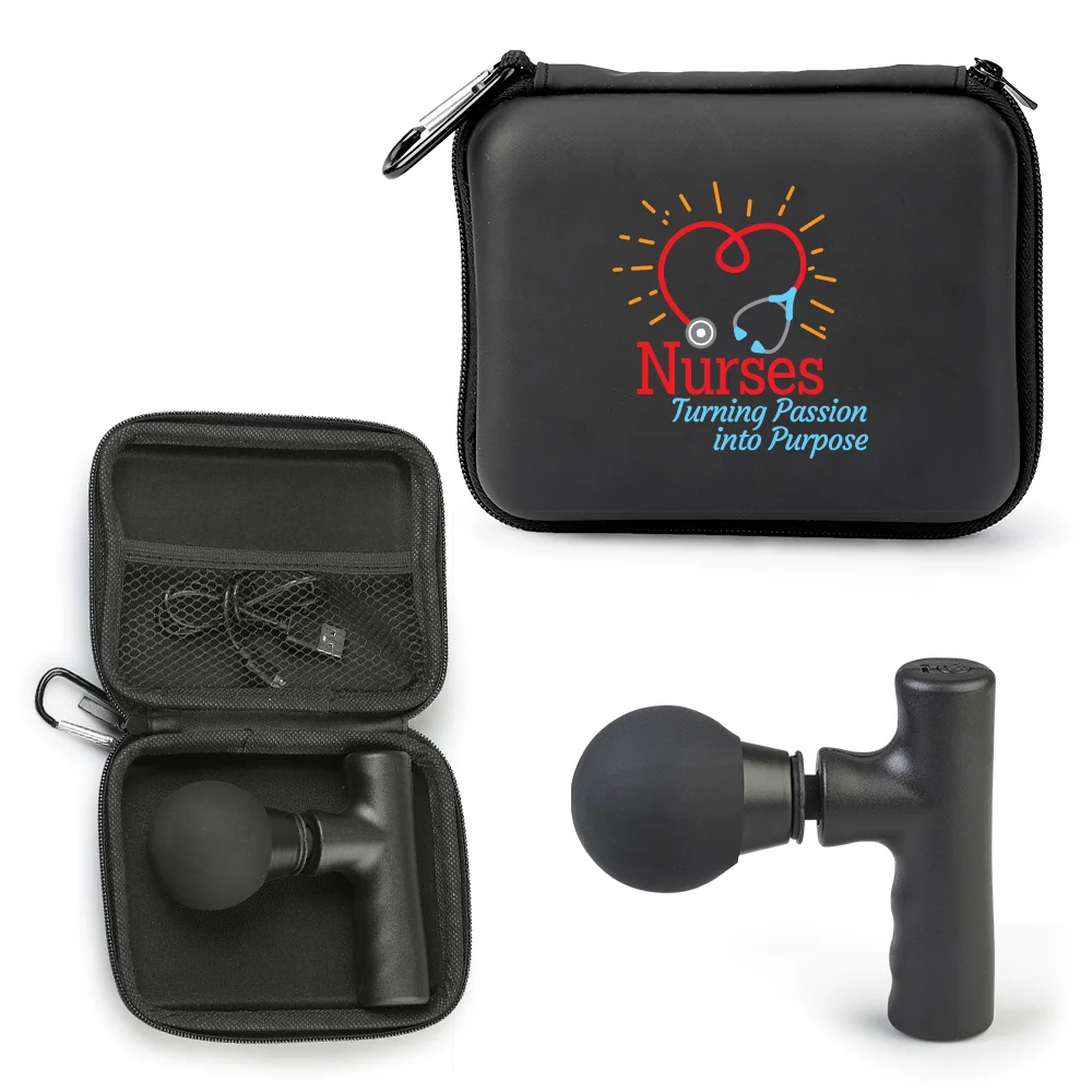 Portable Mini Massage Gun With Carabiner Carry Case: Round massage head with padded silicone cover; Comfort grip with finger grooves; Power button; Two speeds; Noise reduction; 1,200-mAh battery lasts up to 3 1/2 hours at full charge; Includes charging cable & zippered hard carry case