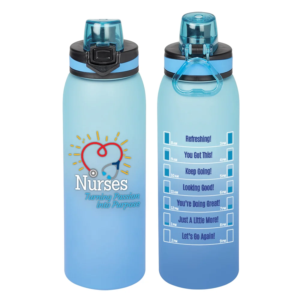 Jasper Ombre Tritan™ Water Bottle 32 oz.: Lightweight, durable Tritan™ will not absorb or retain odors; Pop-up, leak-proof, locking lid with silicone band; Flips up to access sipper spout; Removable strainer beneath lid; Finger loop; Eco friendly; Reusable; BPA free; Note: Hand wash recommended