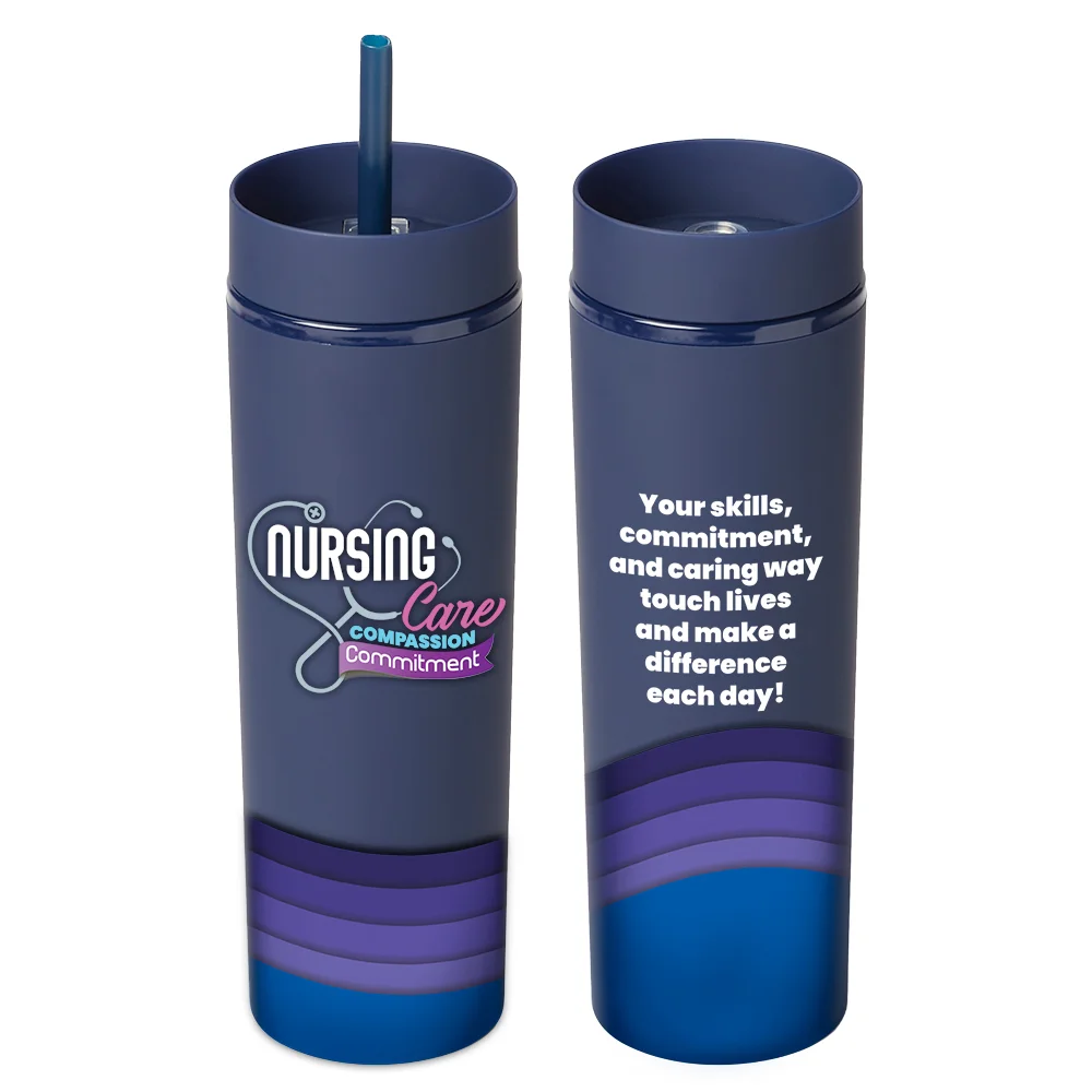 16-oz. Tumbler: Sipping simplified: one lid, two ways to enjoy hot or cold beverages on the go; Double-walled acrylic body with easy-grip, satin, rubberized finish; Screw-on lid with two ways to sip: slide lid opening for hot drinks & straw port opening for cold drinks; Reusable soft straw included; Slips through straw port; Stopper on end prevents spills and keeps it in place; Eco friendly; Reusable; BPA free; Note: Hand wash recommended