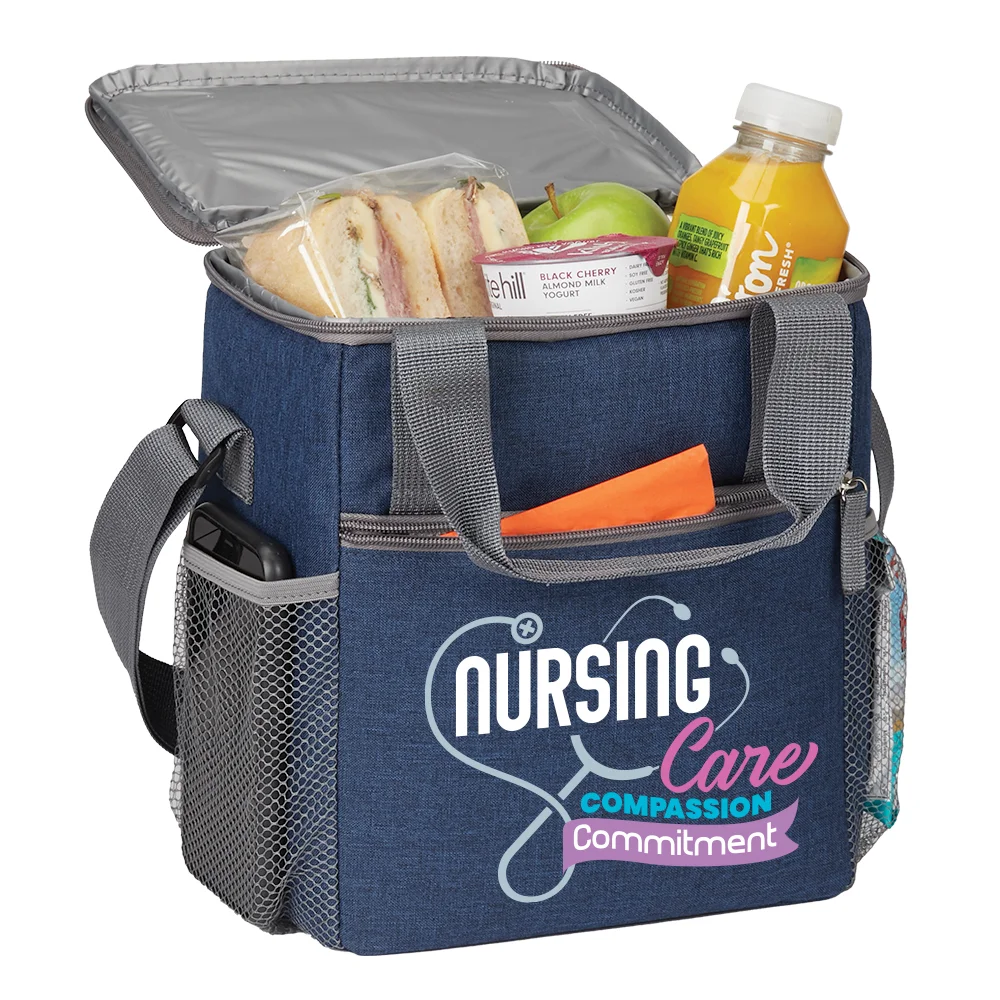 Lunch/Cooler Bag: Dual-zip, insulated main compartment keeps contents colder (or warmer) longer; Front zip pocket stashes napkins and other items; 2 side mesh pockets for a water bottle, utensils, and more; Two carry options: comfort-wrapped handles or padded, adjustable shoulder strap; Holds up to 9 cans; ID window on back; Heathered 600-denier polyester