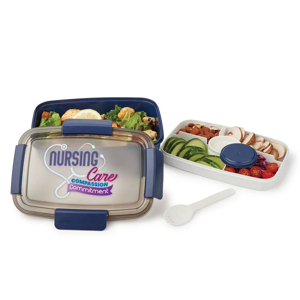 Stacker Container: Two plastic, rectangular stacking containers with a hinged, locking lid; Fork included; Airtight lid with silicone ring seals in freshness and prevents spills; Large bottom container holds 68 oz. (8.5 cups); 4-compartment top tray (2 sections hold 5 oz., 2 hold 3.5 oz.) separates snacks; Lidded, removable 3-oz. container stores dressing, toppings, or sauces; Eco friendly; Reusable; BPA free; Note: Microwave and freezer safe; Dishwasher safe after lid and compartments removed