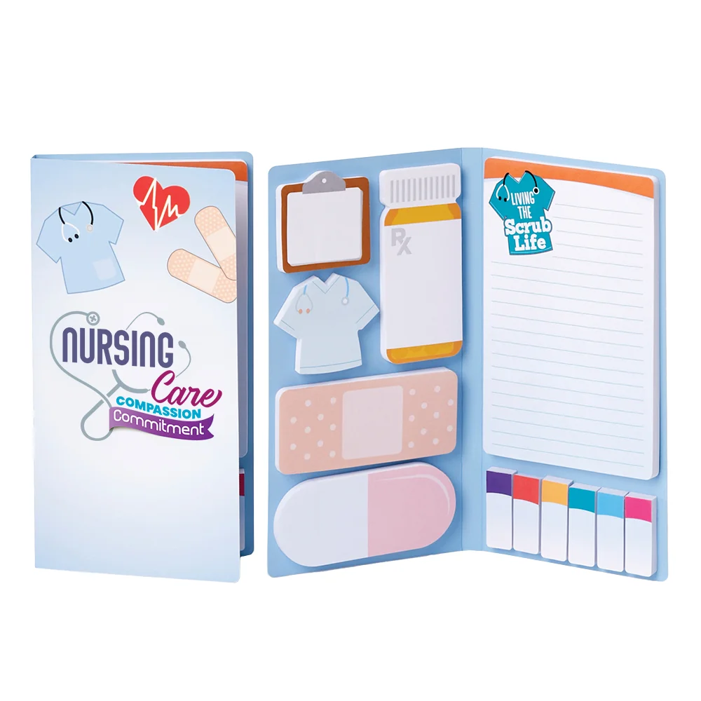 Sticky Note Gift Set: Protective padfolio cover opens to reveal sticky notes, flags, and pads in assorted shapes and sizes; Includes 6 healthcare designs & 6 color-coded flags, each with 50 sheets; 600 sheets total