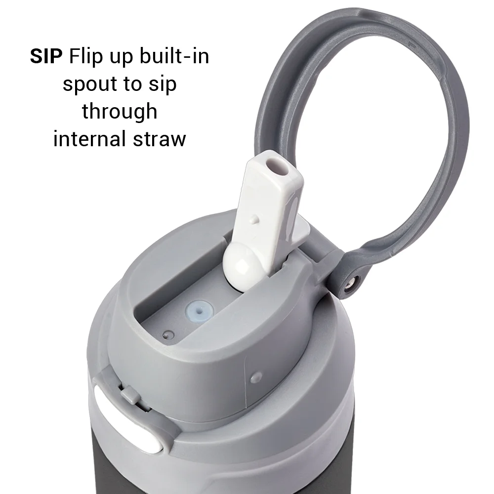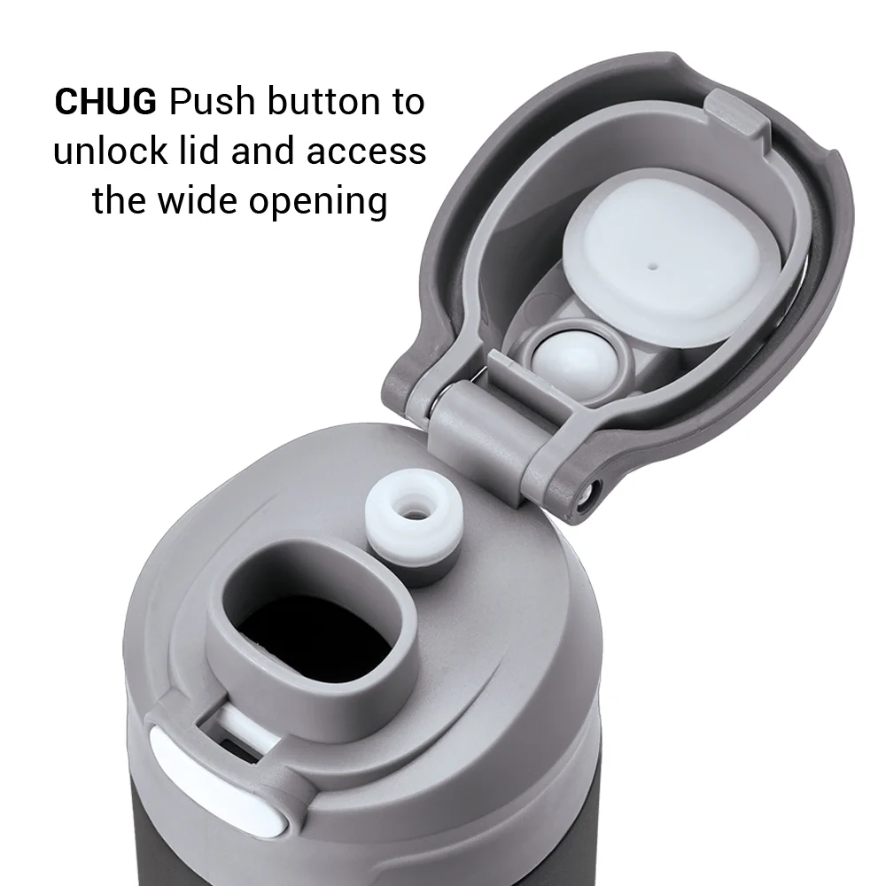 28-oz. Water Bottle: Dual-function, push-button, spill-proof locking lid; Sip: flip up built-in spout to sip through internal straw; Chug: push button to unlock lid and access the wide opening; Extra-wide mouth for easy filling and cleaning; Easy-carry loop built into lid; Tough, impact-resistant, and shatter-resistant Tritan™; Eco friendly; Reusable; BPA free; Note: Hand wash recommended