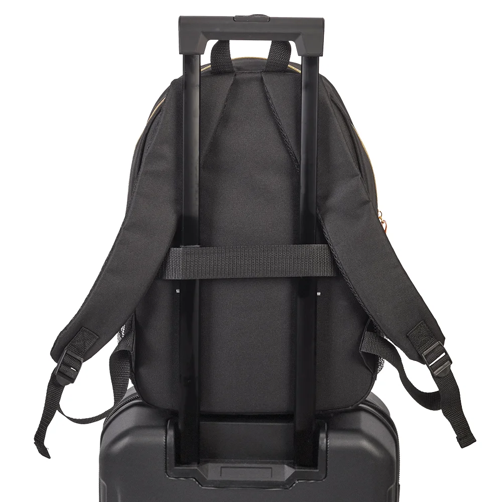 • Trolley strap on back slips over luggage handles for travel ease