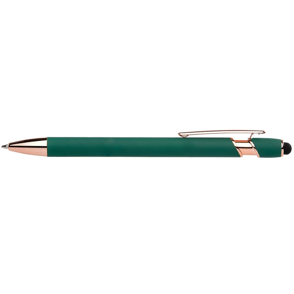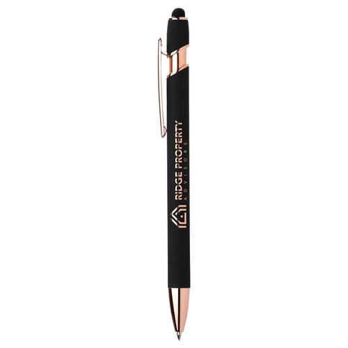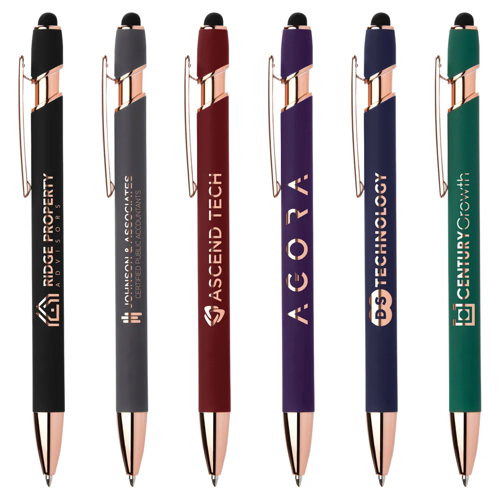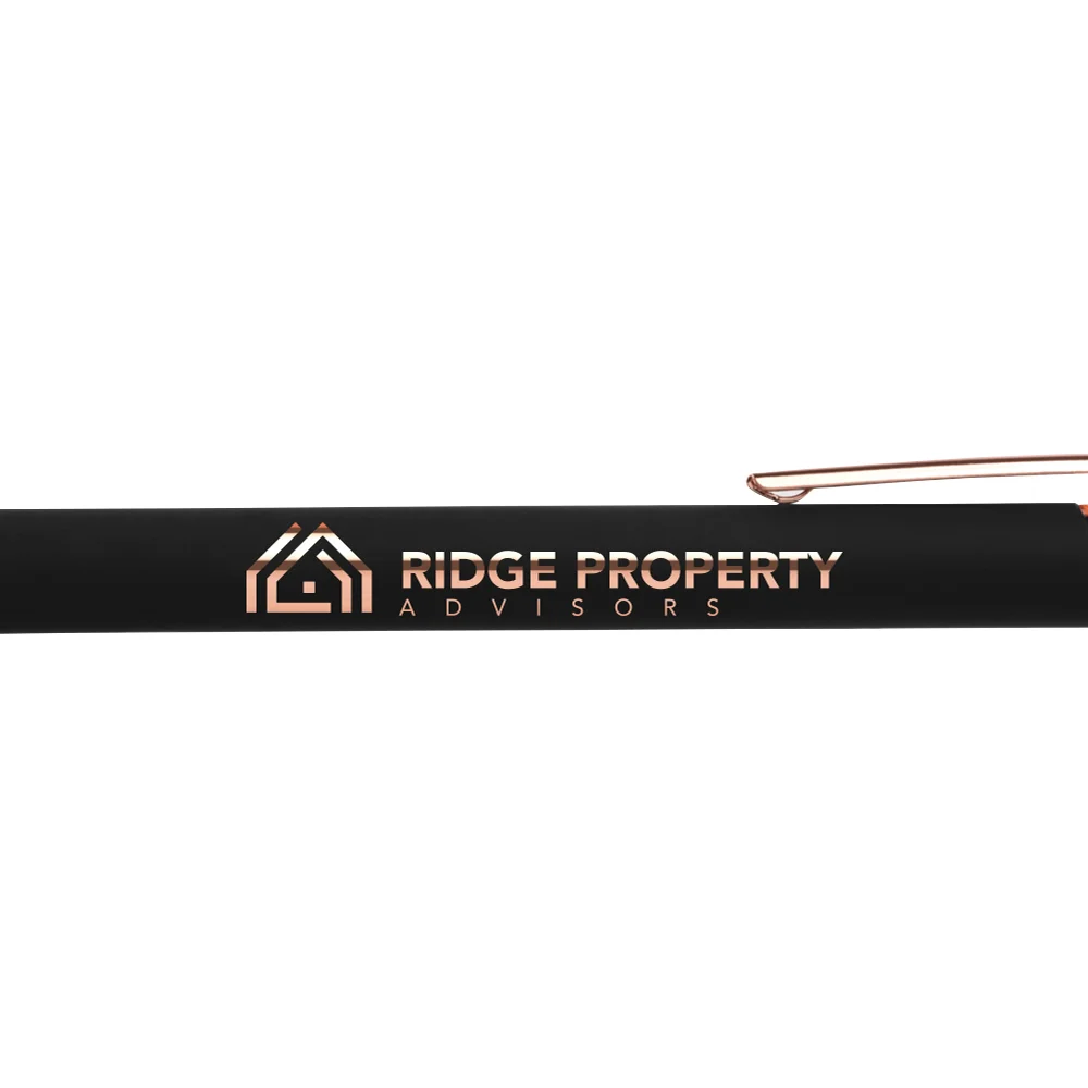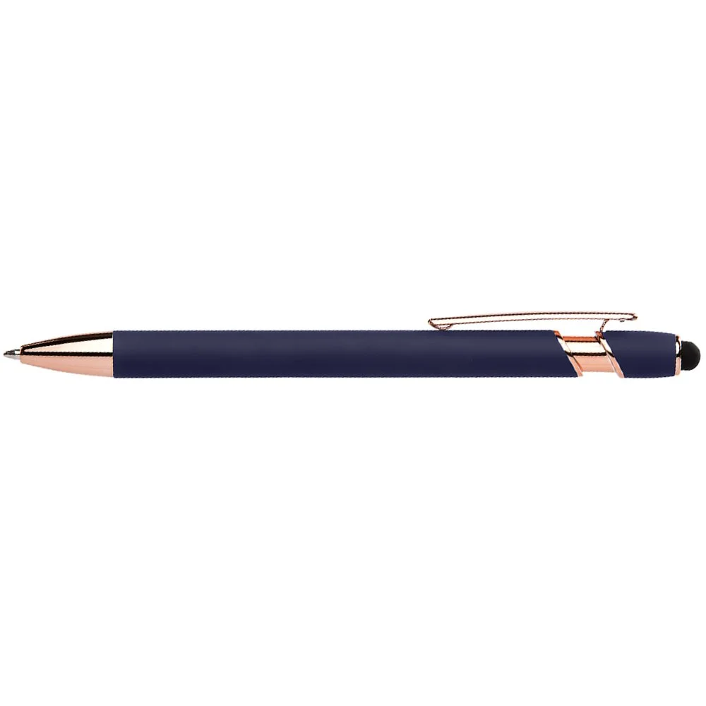 • Soft-touch aluminum pen with mirror-finish rose-gold trim: stylish, premium, and trendy