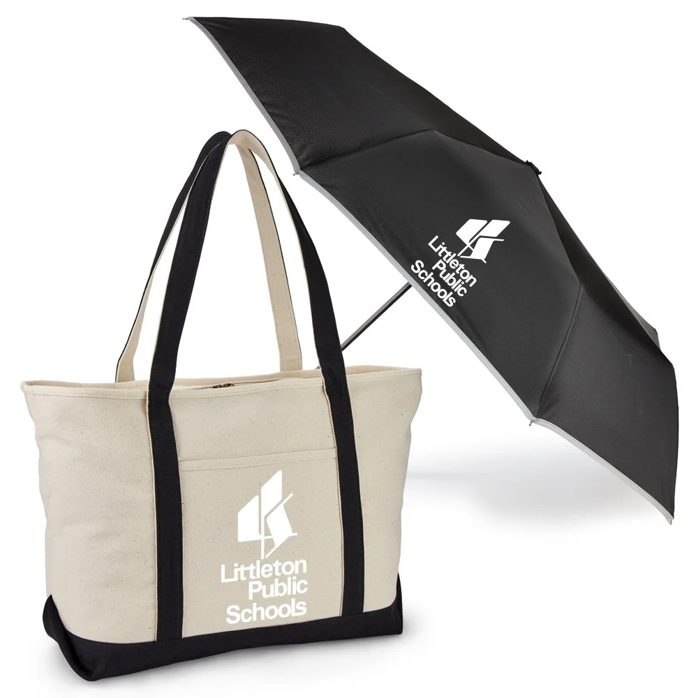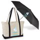 2-piece gift set includes: Oversized Boater 24-oz. Cotton Canvas Tote Bag & 46" rPET/UV Auto Open & Close Umbrella With Reflective Trim & Carabiner Handle