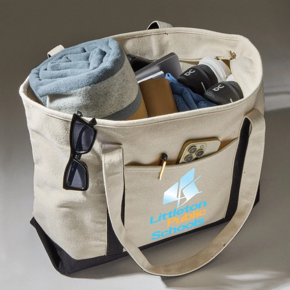 Personalized Tote Bag: Super spacious, dual-zip main compartment; Natural color with contrasting 30" shoulder straps and trim; Interior pocket and easy-access front slip pocket; Durable 24-oz. cotton canvas; Velcro-closure interior slip pocket secures phone, keys, and more