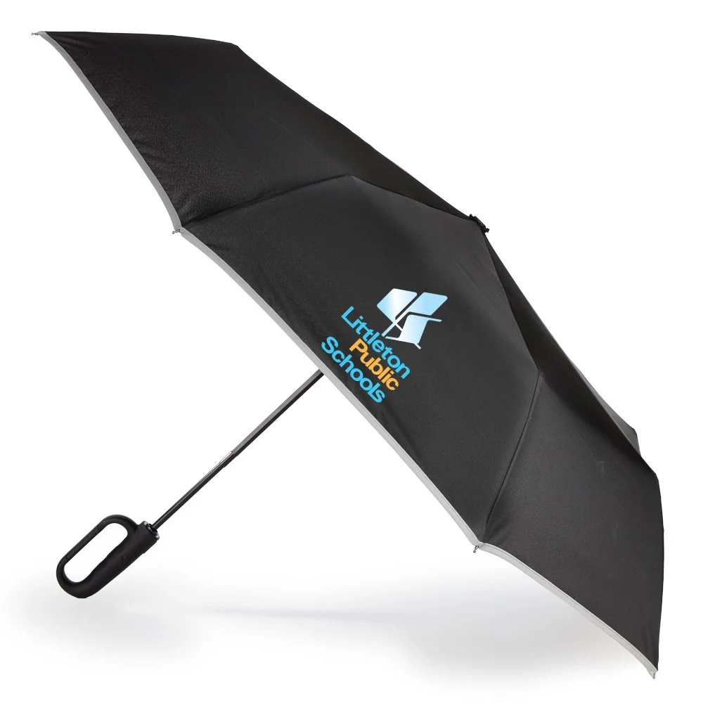 Personalized 46" Umbrella: 8 panels; 46" canopy arc; Fiberglass ribs and frames; Trim reflects street lights and headlights; Push button for one-hand auto open/close; Versatile carabiner handle: easy to grip, clip to a bag, or hang up to dry; Telescoping iron shaft folds for transport; Eco-friendly rPET 190T pongee; PFAS free; C-Zero water-repellent coating (no harmful chemicals); SPF-50 sun protection; High-visibility trim; Matching sleeve included