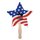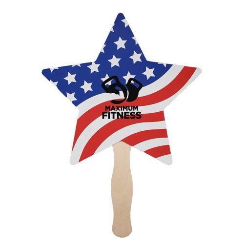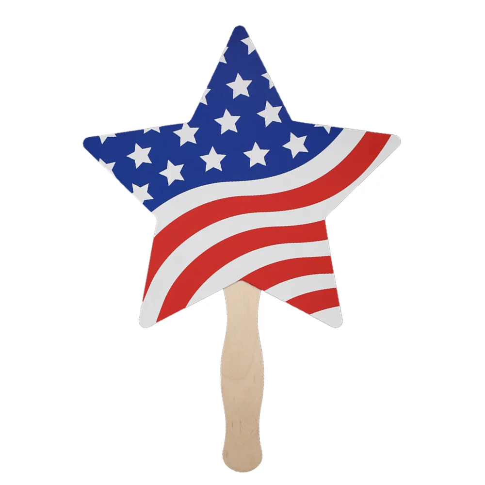 Fans come in the shape of a star with the American flag design on it and a wooden handle glued to the back