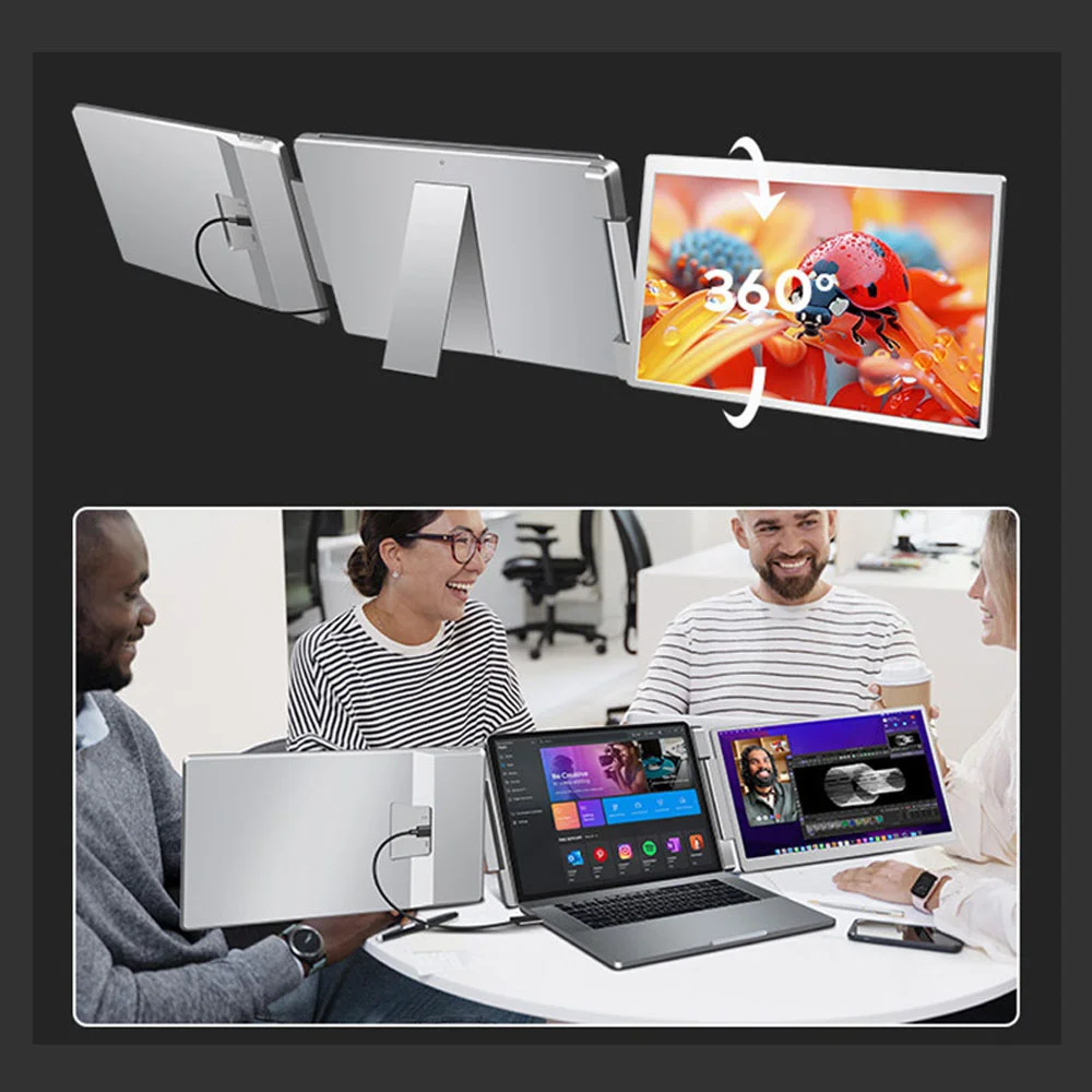 • Left-side monitor flips 360 degrees horizontally or 360 degrees vertically so you can easily share your screen during crucial business meetings