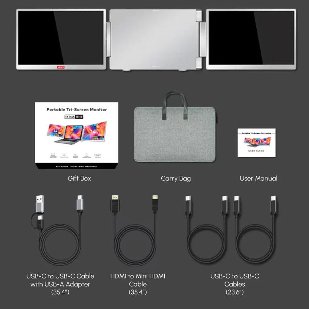 • Includes a carry bag, three Type-C-to-Type-C cables (one with a USB-A adapter), HDMI-to-Mini-HDMI cable, and a user manual