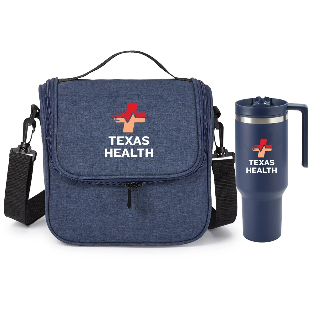 2-piece gift set includes: Portland Lunch/Cooler Bag & Quencher Stainless-Steel/Plastic-Lined Tumbler 40 oz. With Handle