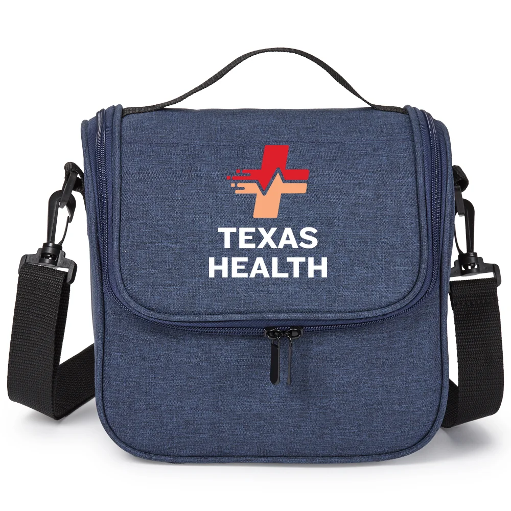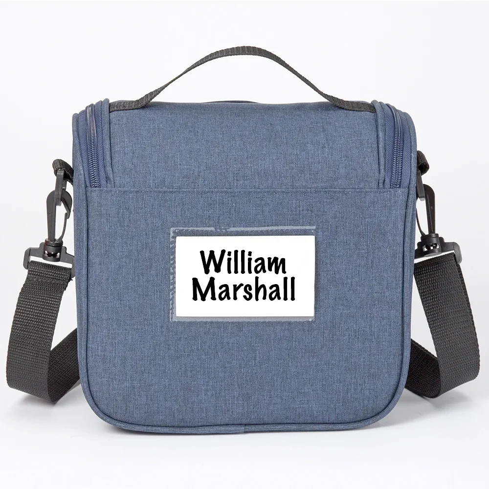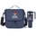 Personalized Lunch/Cooler Bag: Dual-zip, foam-insulated, leak-resistant compartment ideal for stacking containers or up to 6 cans with ice; Interior is easy to wipe clean in case of any spills; Fits most food containers for convenient meals on the go; Exterior slip pocket for napkins and quick-grab items; Heathered 300-denier material with bright-blue lining and PEVA foam insulation; Adjustable, removable strap for shoulder or crossbody carry; Top carry handle; ID window on the back