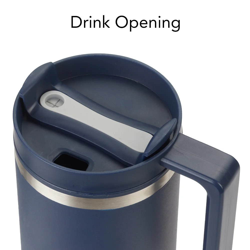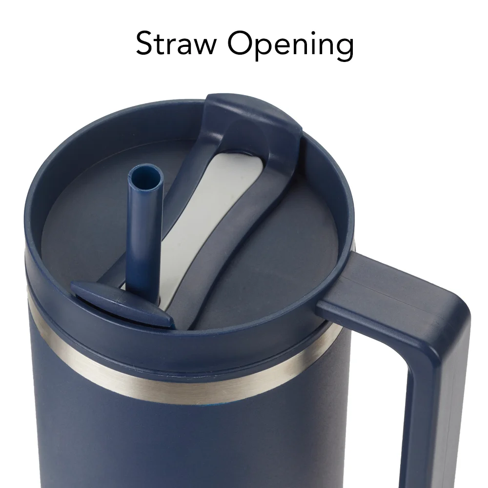 Personalized 40-oz. Tumbler: Double-wall insulated tumbler: stainless-steel outer and plastic liner; Maintains optimal hot or cold temperature; Splash-proof, threaded, 3-position rotating lid: Straw opening with included reusable straw, drink opening, & fully sealed; Sturdy handle for a sure grip; Tapered base fits most car cup holders; Eco friendly; Reusable; BPA free; Note: Tumbler: Hand-wash only; Straw: Dishwasher safe