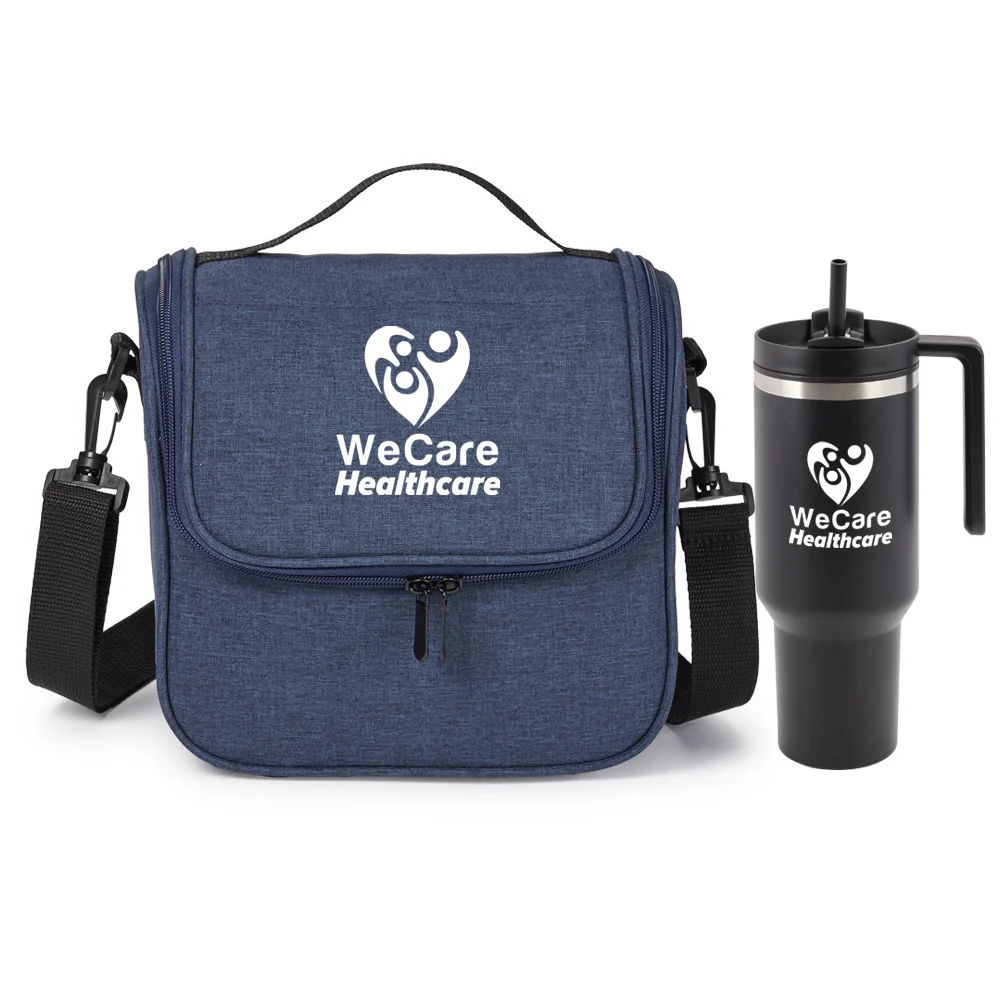 2-piece gift set includes: Portland Lunch/Cooler Bag & Quencher Stainless-Steel/Plastic-Lined Tumbler 40 oz. With Handle