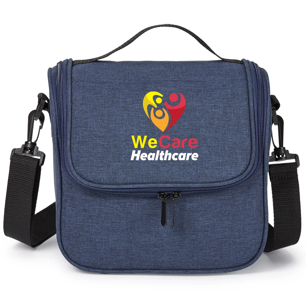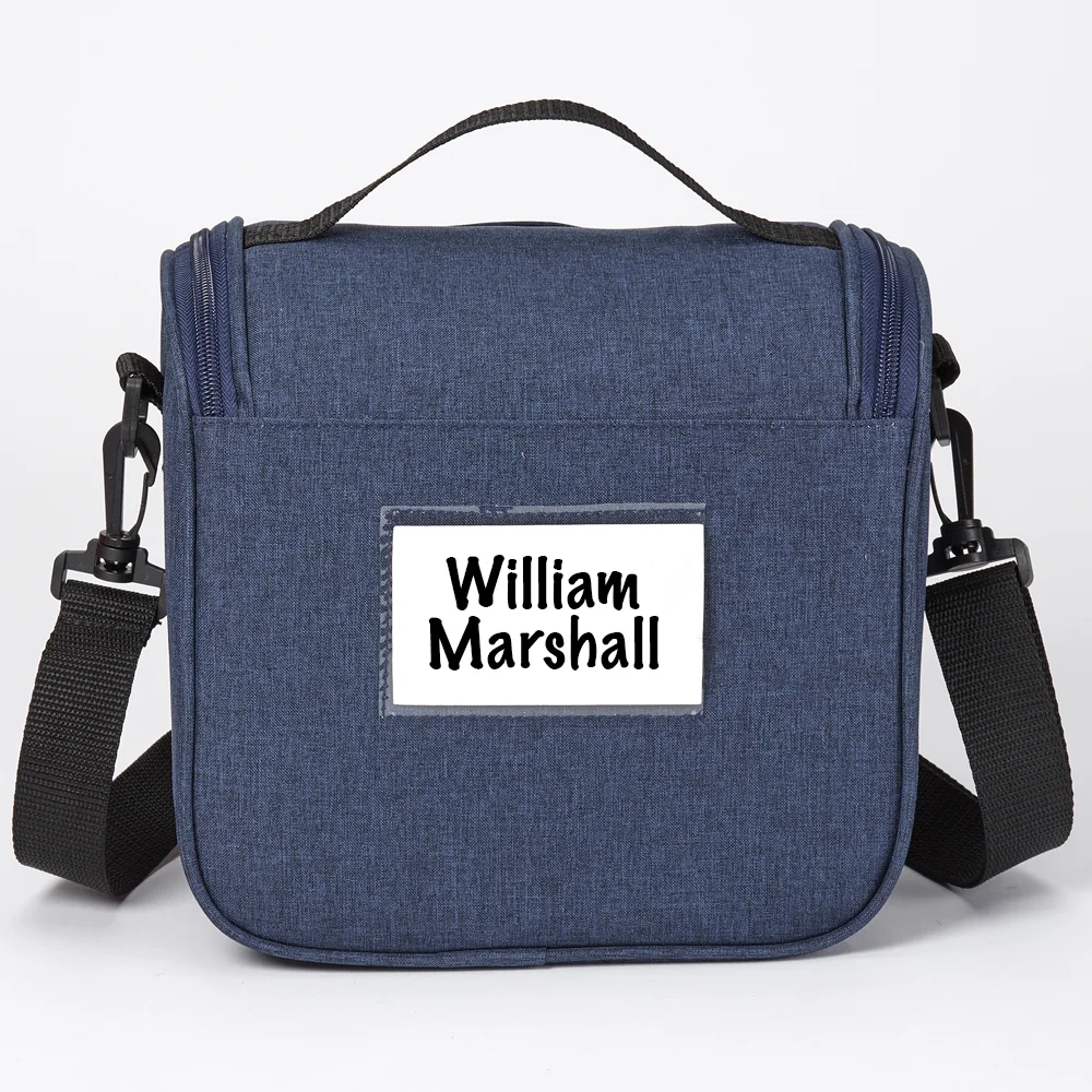 Personalized Lunch/Cooler Bag: Dual-zip, foam-insulated, leak-resistant compartment ideal for stacking containers or up to 6 cans with ice; Interior is easy to wipe clean in case of any spills; Fits most food containers for convenient meals on the go; Exterior slip pocket for napkins and quick-grab items; Heathered 300-denier material with bright-blue lining and PEVA foam insulation; Adjustable, removable strap for shoulder or crossbody carry; Top carry handle; ID window on the back