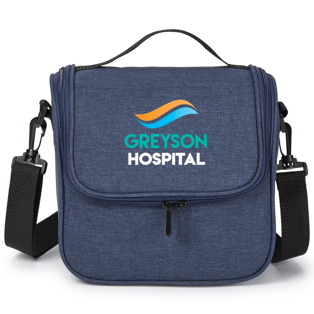 Personalized Lunch/Cooler Bag: Dual-zip, foam-insulated, leak-resistant compartment ideal for stacking containers or up to 6 cans with ice; Interior is easy to wipe clean in case of any spills; Fits most food containers for convenient meals on the go; Exterior slip pocket for napkins and quick-grab items; Heathered 300-denier material with bright-blue lining and PEVA foam insulation; Adjustable, removable strap for shoulder or crossbody carry; Top carry handle; ID window on the back