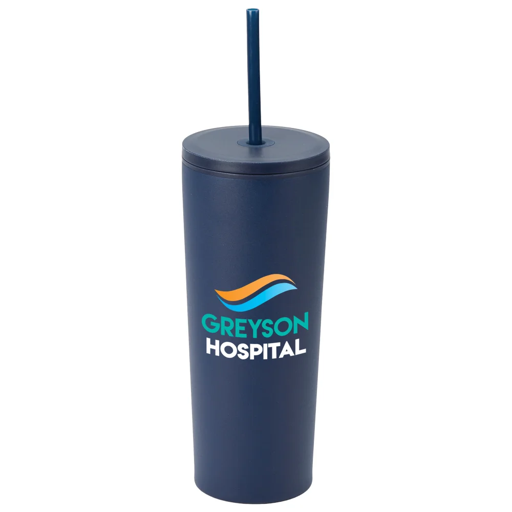 Personalized 24-oz. Tumbler With Dual Lids: Double-wall insulated: stainless-steel exterior and plastic liner maintain temperature for hours; 2 insulated lids: Leak-proof flip lid for hot drinks; Splash-proof straw lid for cold drinks; included straw slides through center; No-slip, no-sweat powder-coat finish; Tapered to fit most car cup holders; Eco friendly; Reusable; BPA free; Note: Hand wash only
