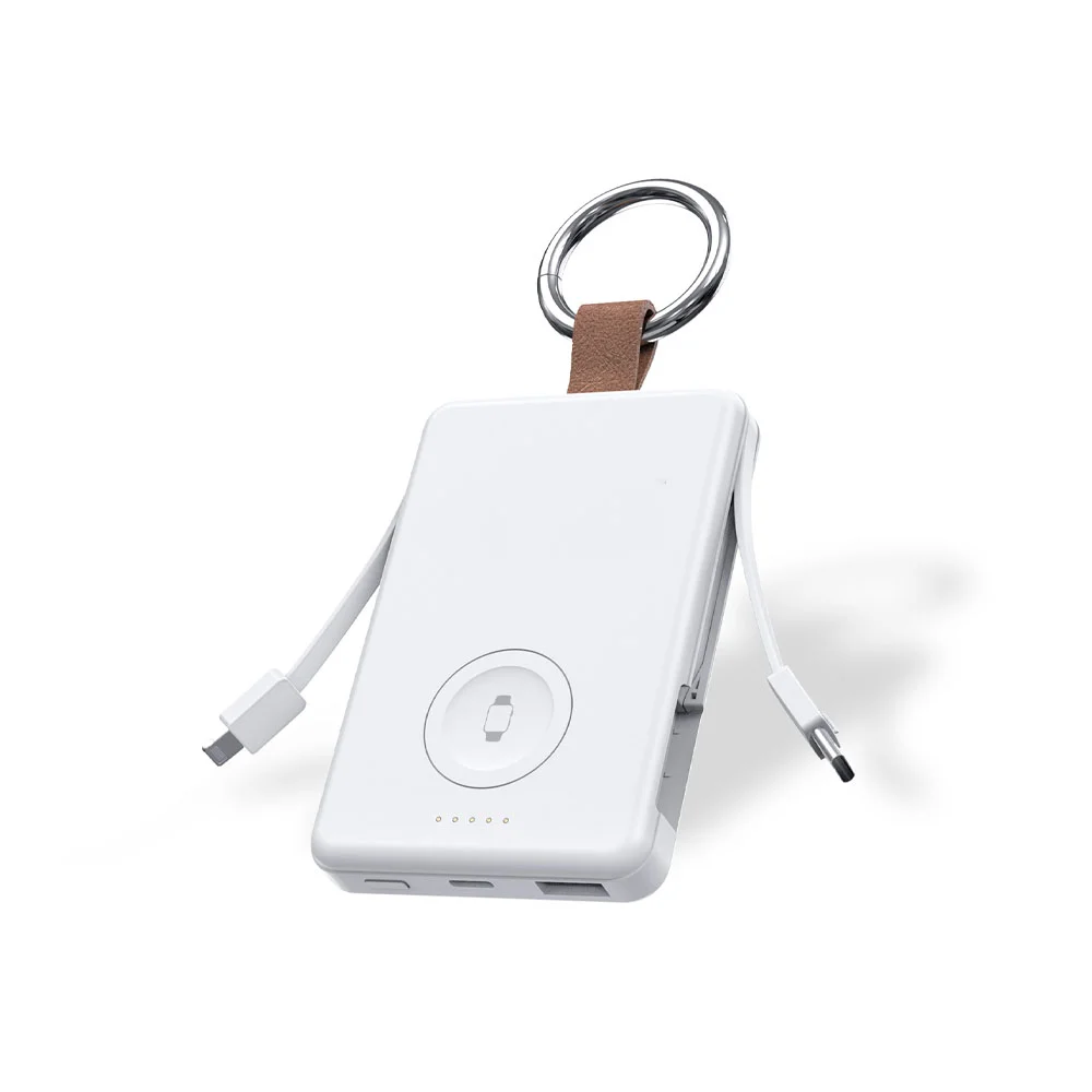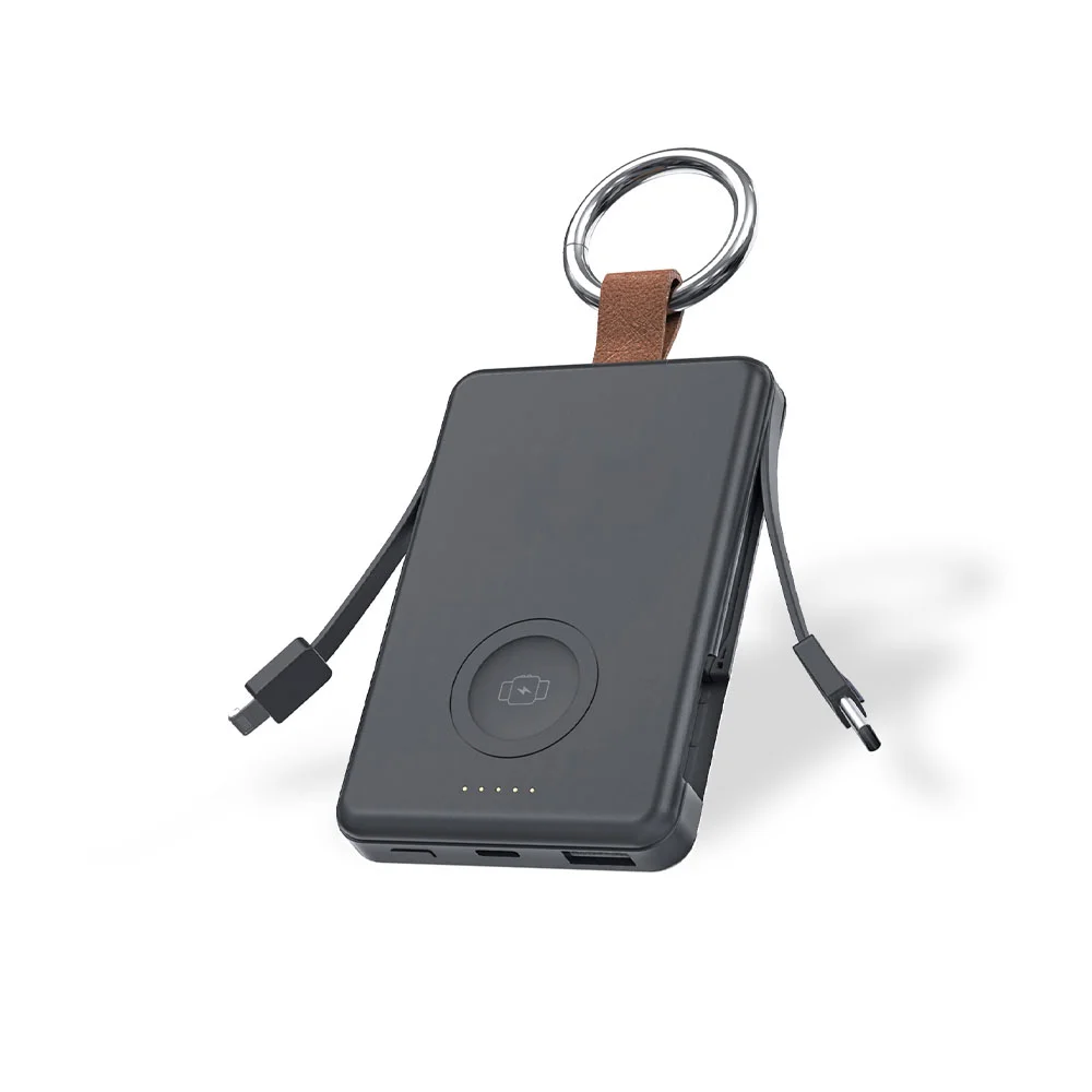 5,000-mAh Power Bank: Supports both Apple® & Samsung® smartwatch charging; Built-in Type-C and Lightning cables; Type-C and USB-A ports; Leather loop with metal key ring