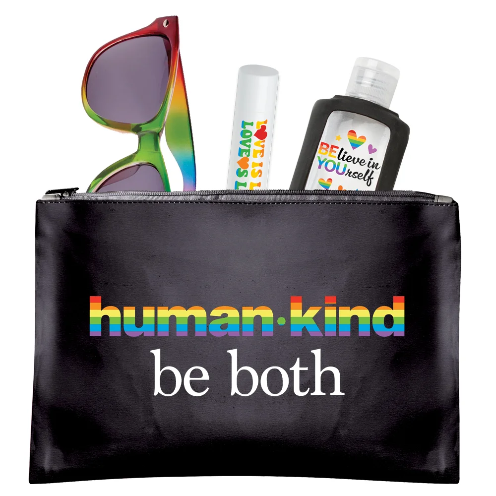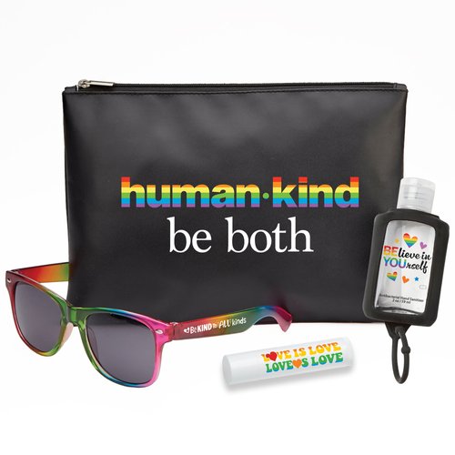 4-piece set includes: Vinyl Pouch, Rainbow Sunglasses, Lip Balm, & 2-oz. Hand Sanitizer With Silicone Holder
