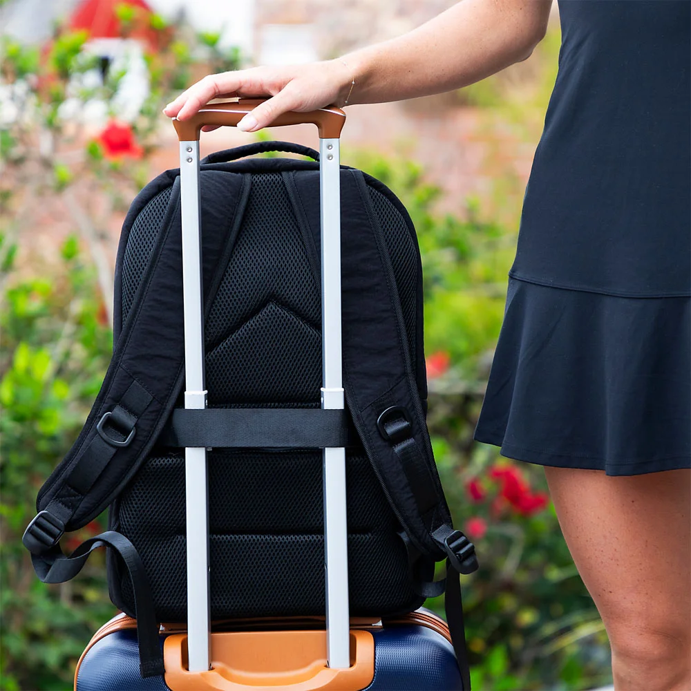 • Trolley strap on back easily slips onto a luggage handle