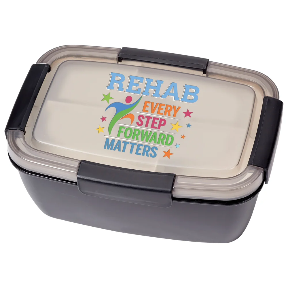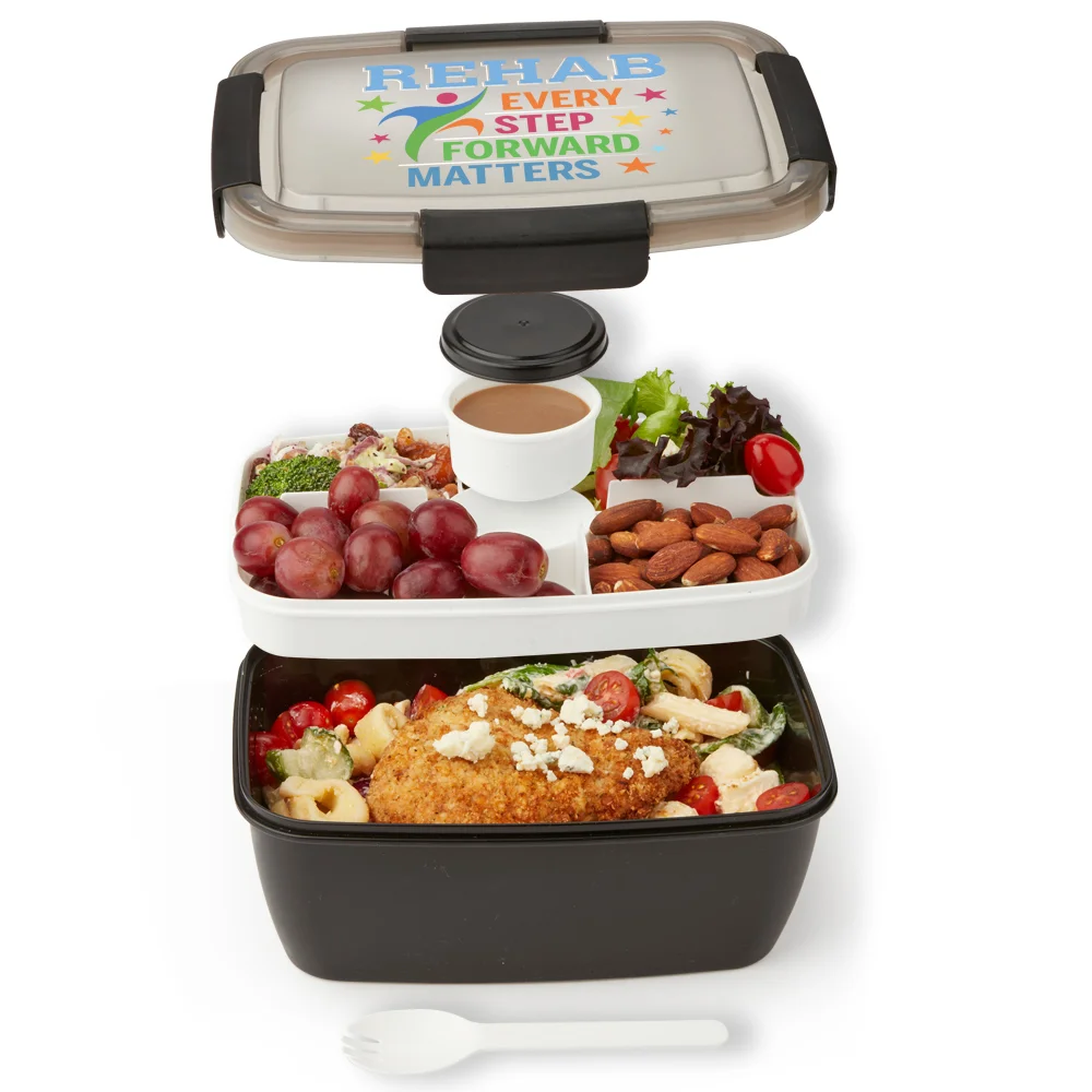 Locking Stacker Food Container 68 oz.: Two plastic stacking containers; Fork included; Hinged, locking lid; Silicone ring seals freshness, prevents spills; Large bottom container holds 68 oz.; 4-compartment top tray (2 hold 5 oz., 2 hold 3.5 oz.); Removable 3-oz. container; Eco friendly; Reusable; BPA free; Note: Microwave & freezer safe; Dishwasher safe after lid & compartments removed