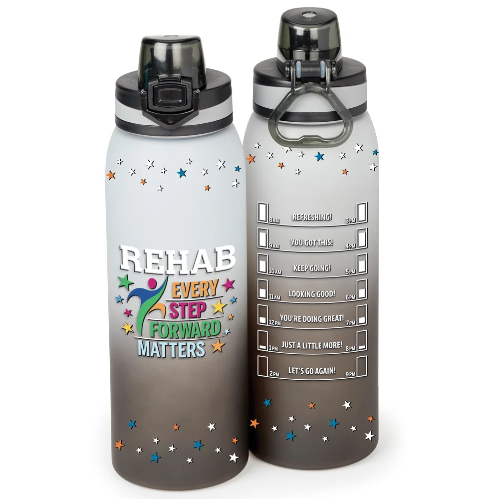 Jasper Ombre Tritan™ Water Bottle 32 oz.: Lightweight, durable Tritan™ will not absorb or retain odors; Pop-up, leak-proof, locking lid with silicone band; Flips up to access sipper spout; Removable strainer beneath lid; Finger loop; Eco friendly; Reusable; BPA free; Note: Hand wash recommended