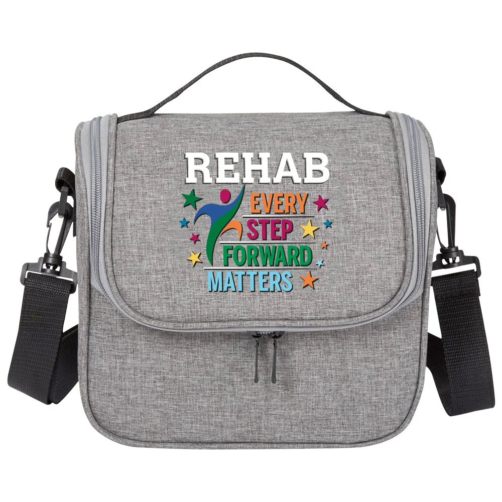 Portland Lunch/Cooler Bag: Dual-zip, leak-resistant compartment holds up to 6 cans with ice; Wipe-clean interior; Exterior slip pocket; Heathered 300-denier material; PEVA foam insulation; Adjustable, removable strap; Top carry handle; ID window