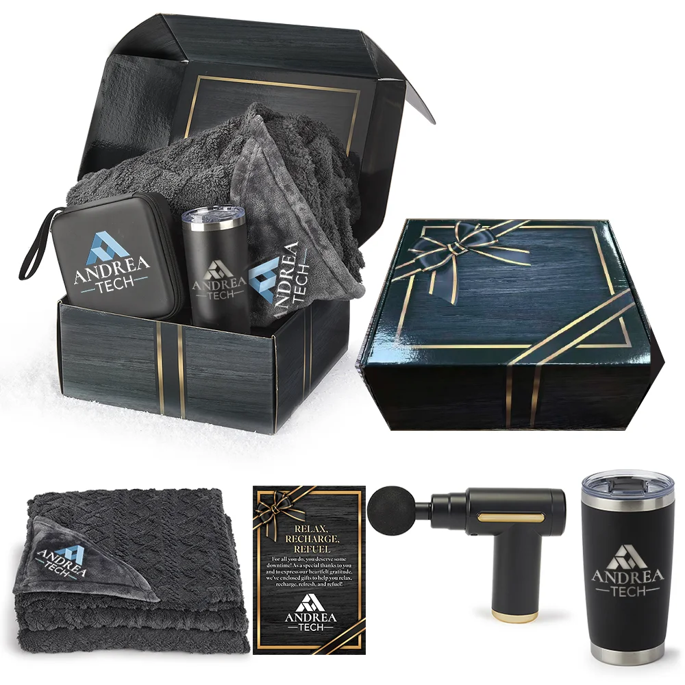 Massage Gun: 5 1/4" X 5",Case:7" X 7" X 2 3/4", Tumbler: 20-Oz.; Card: 4" X 6";, Blanket: 50"X 60"