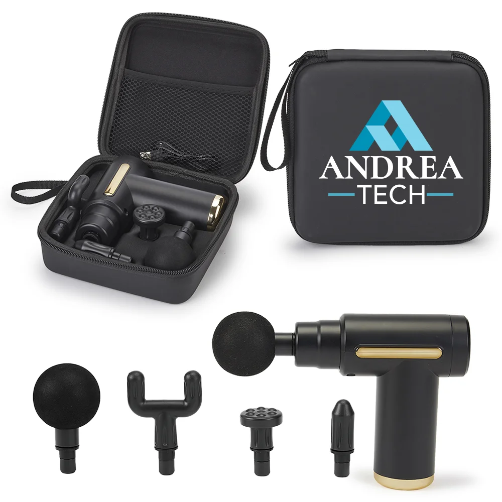 Personalized Massager: Compact, cordless, portable, powerful; 4 interchangeable attachments: Round Head, Fork Head, Flat Head, & Bullet Head; 2,400 mAh; 6 speed options; Power button and Type-C input on end; Press once for battery indicator lights; Press again to adjust speed; Working time: 30 minutes; Charging time: 3 hours; FCC ce; Type-C-to-USB charging cable included; Hard EVA zipper case; Gift box & instructions included