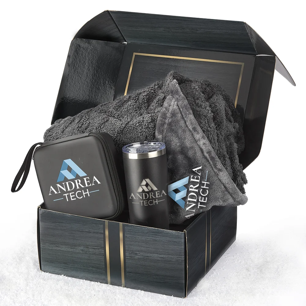 3-piece gift set includes: Cable-Knit Mink Fleece Throw Blanket 50" x 60", Daily Dose of Positivity QR Templock Stainless-Steel Vacuum-Insulated Tumbler 20 oz., & Elite Deep Tissue Massage Gun With Carry Case - plus a free Appreciation Card
