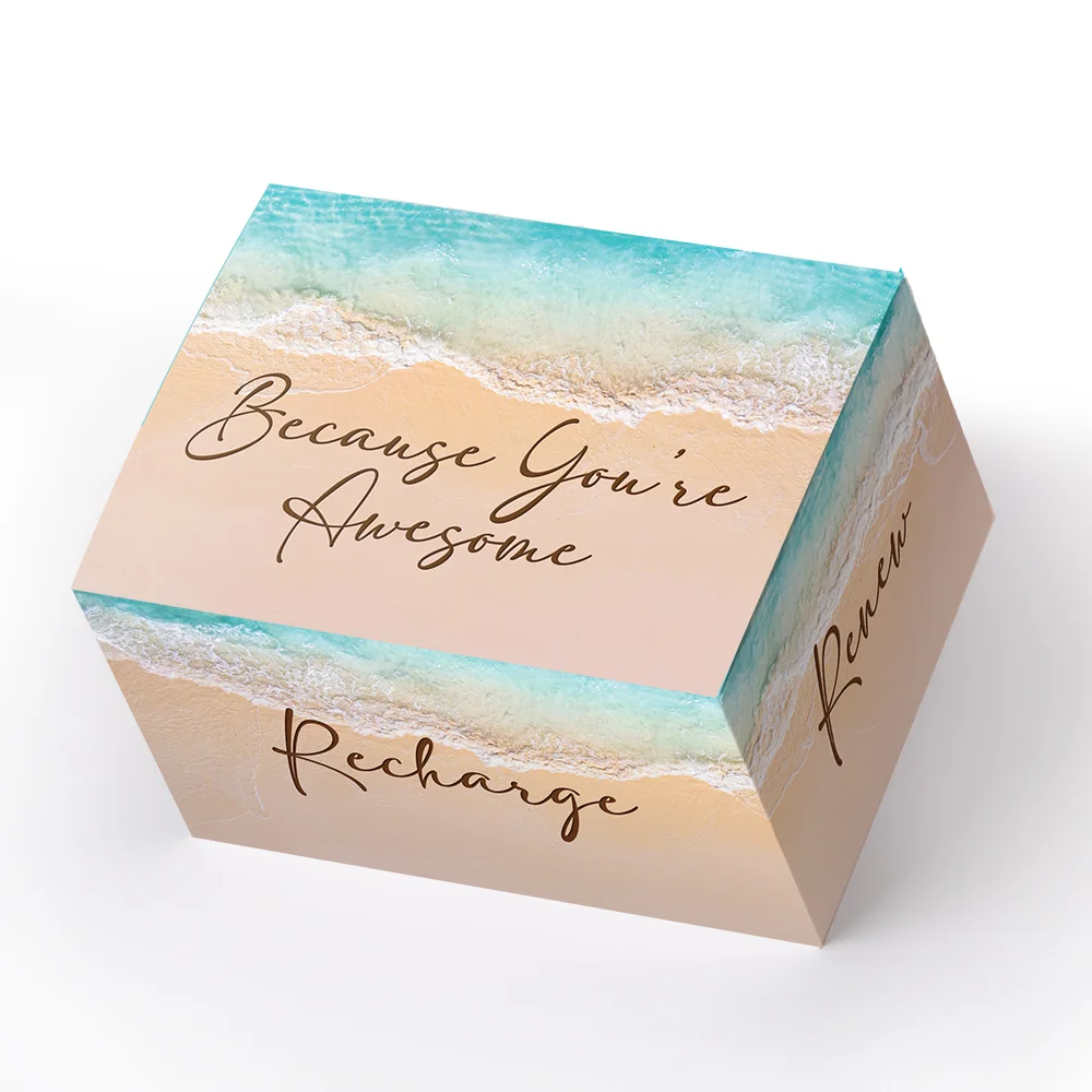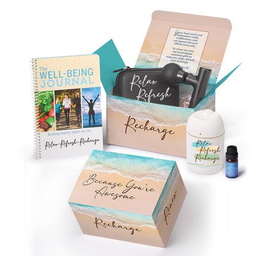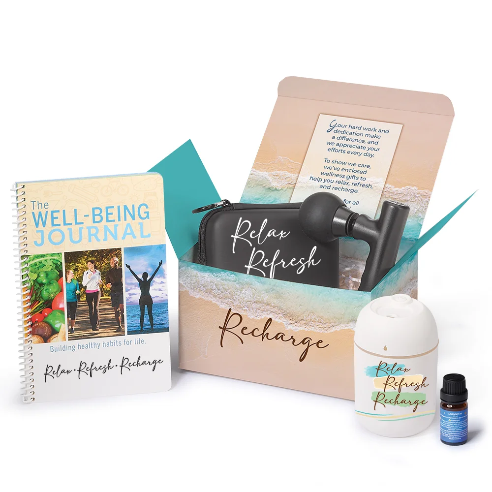 Gift box included; Message inside lid: Your hard work and dedication make a difference, and we appreciate your efforts every day. To show we care, we've enclosed wellness gifts to help you relax, refresh, and recharge. Thank you for all that you do!
