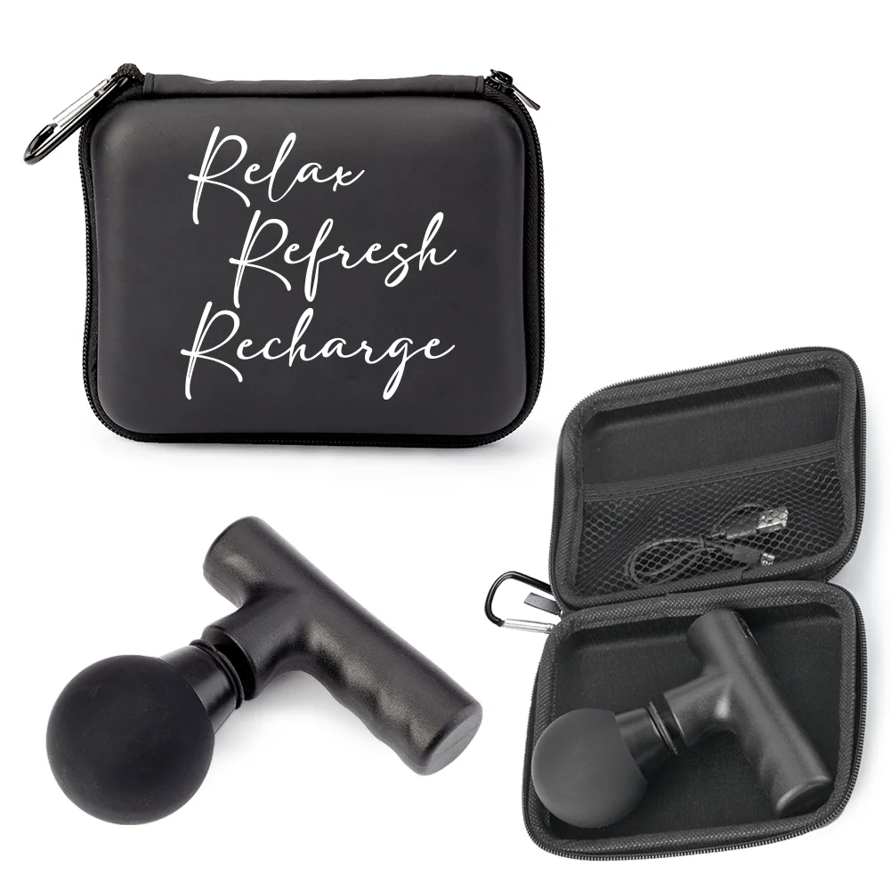 Massage Gun: Compact, yet powerful tool alleviates muscle stiffness and soreness and enhances blood circulation; Round massage head with padded silicone cover; Comfort grip with finger grooves; Power button with two speeds for a custom massage experience; Noise reduction for quiet comfort; 1,200-mAh battery lasts up to 3 1/2 hours at full charge; Includes USB-C to USB-A charging cable and a zippered hard carry case for easy storage & travel