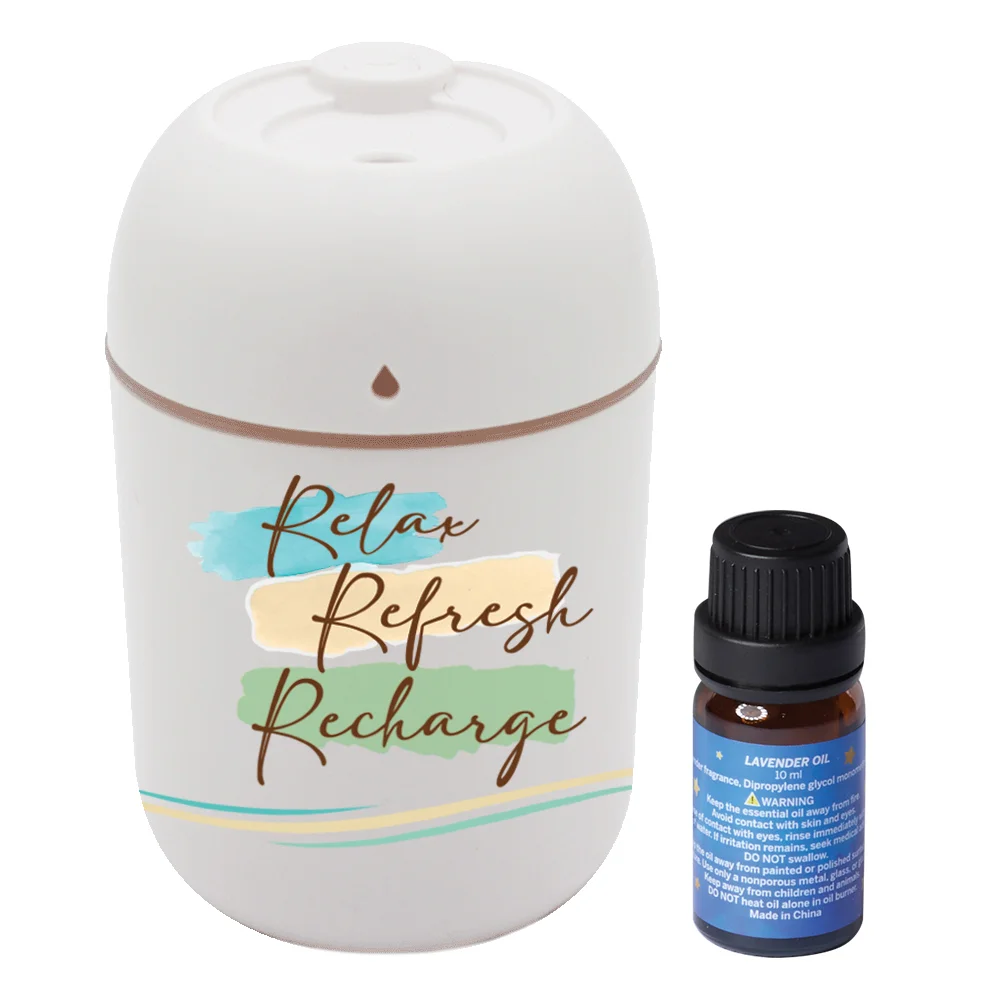 Humidifier/Diffuser: Easy to use: just add water to the tank for humidification; Lavender essential oil and 2 diffuser swab rods included: add 1 to 2 drops for a natural aromatherapy scent-sation; Continuous and intermittent spray options: Press once for continuous (3+ hours), twice for intermittent (up to 6 hours), three times to turn off; Mood lighting ring rotates between 7 colors; Space-saving design for home or on the go; Instructions and USB power cable included