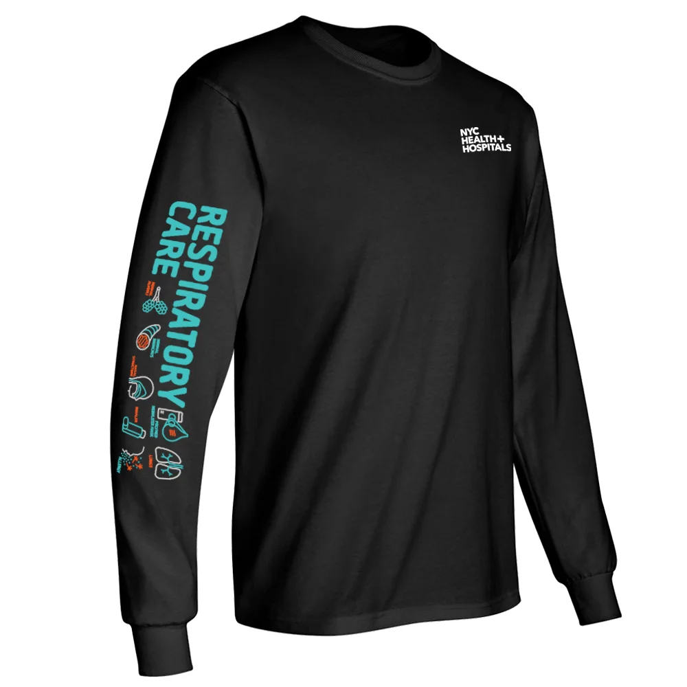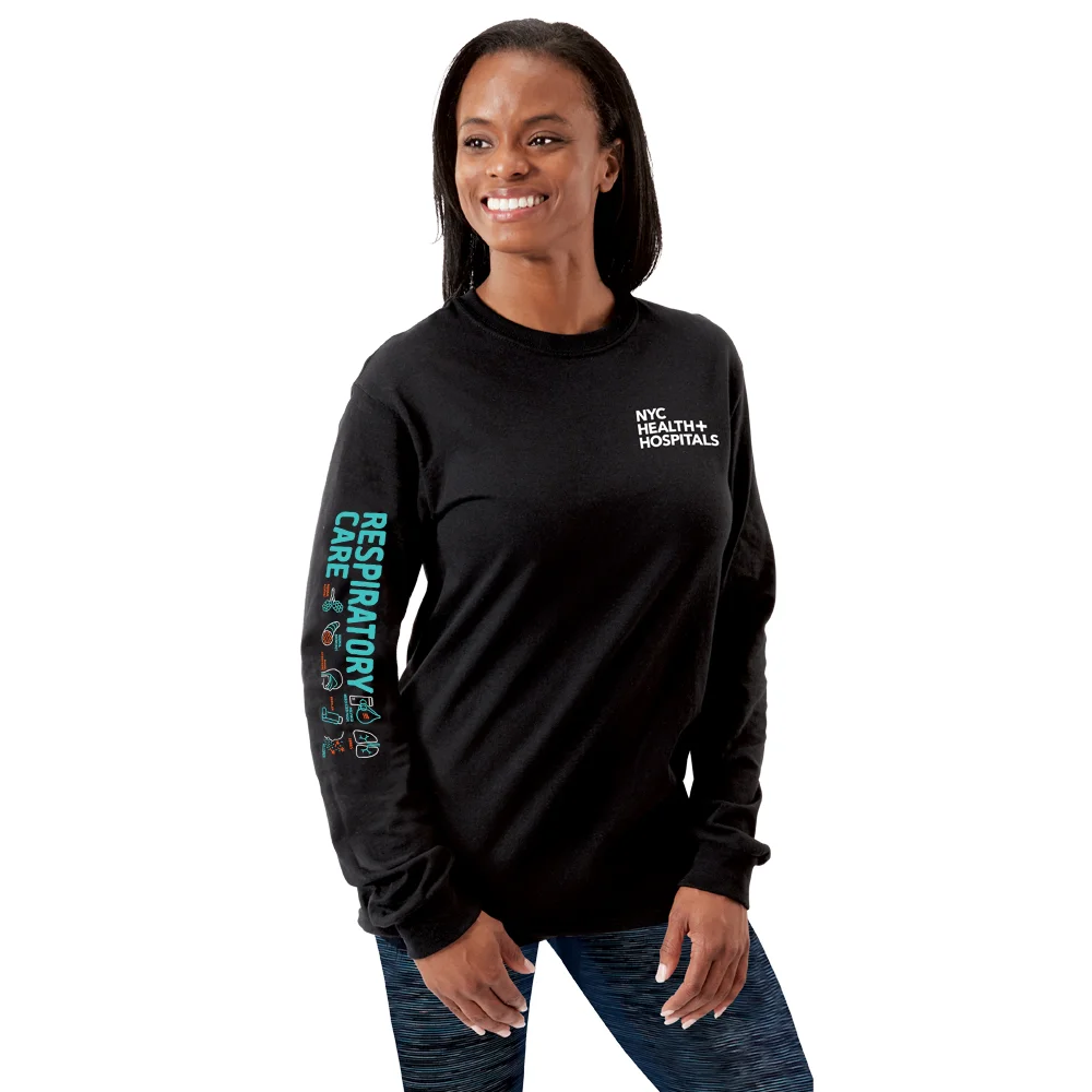 Respiratory Therapists: The World Breathes Easier With Us Unisex 2-Sided Long-Sleeved T-Shirt - Silkscreened Personalization Available