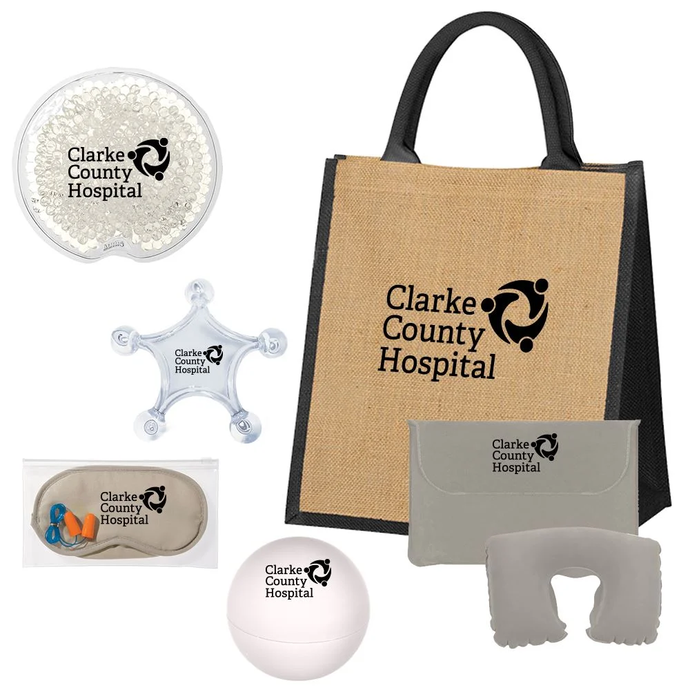 Kit includes: star shape massager, small round gel beads hot/cold pack, ear plugs and eye mask set, travel neck pillow, rubberized lip moisturizer ball, and escape jute tote bag