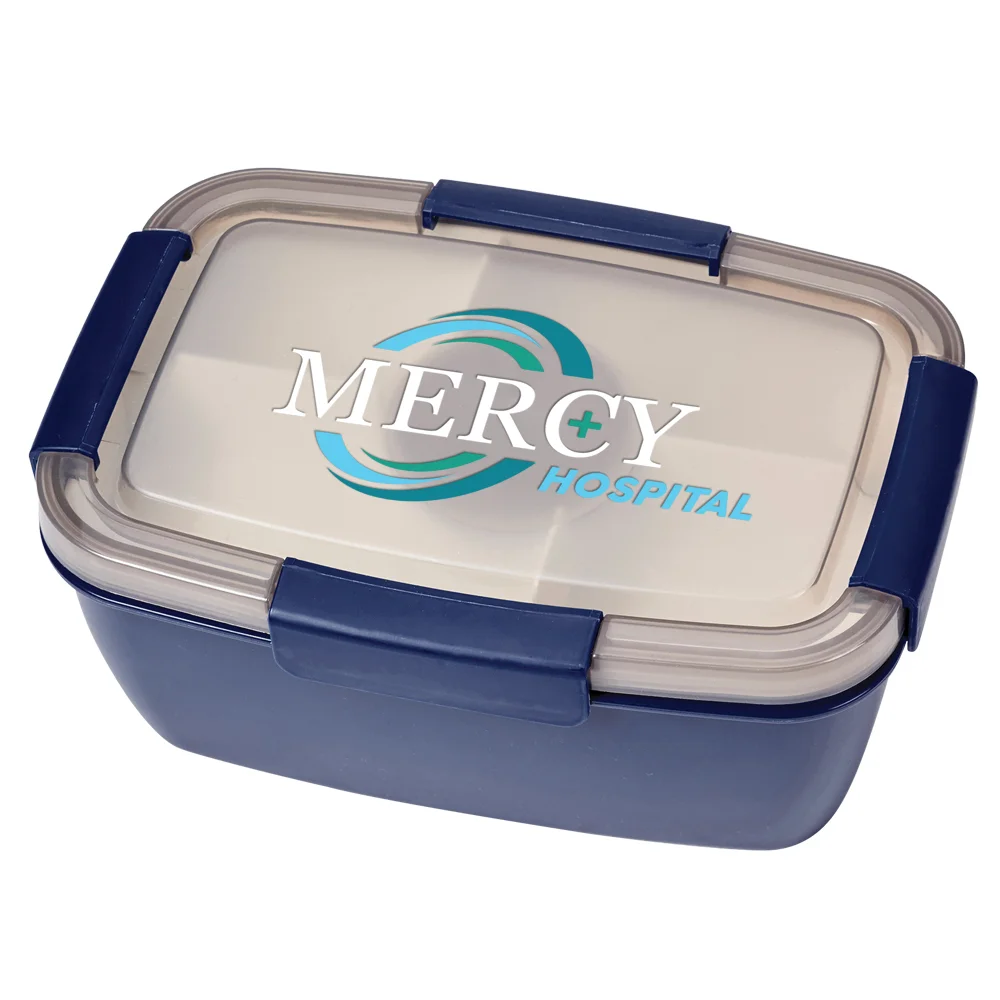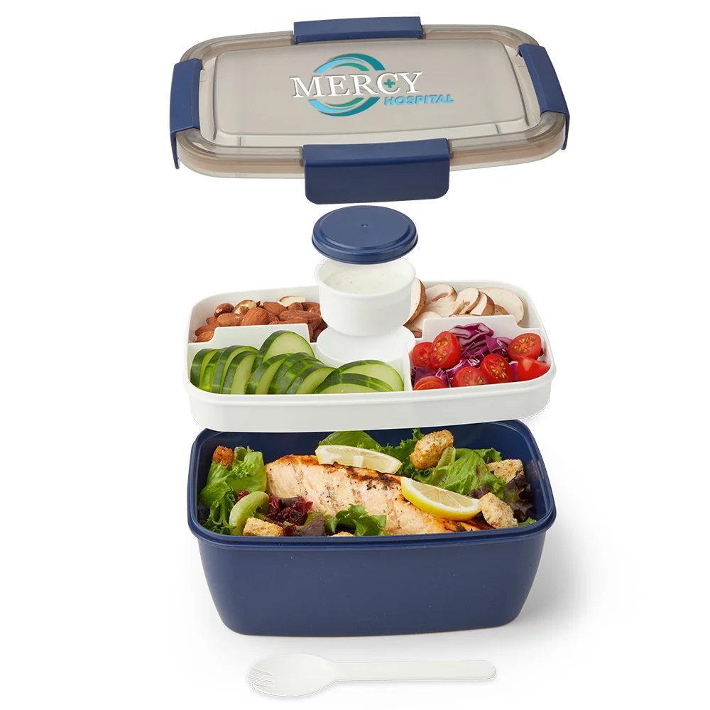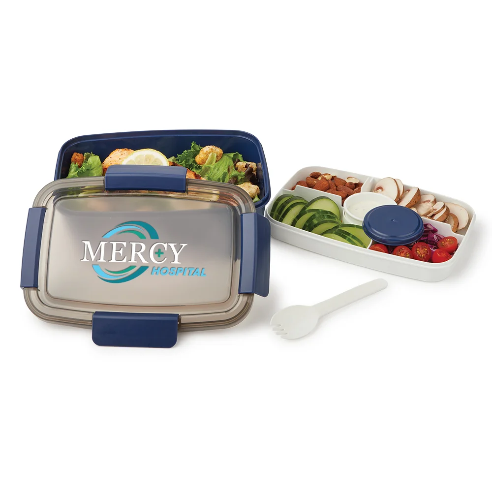 Personalized Stacker Container: Two plastic, rectangular stacking containers with a hinged, locking lid; Fork included; Airtight lid with silicone ring seals in freshness and prevents spills; Large bottom container holds 68 oz. (8.5 cups); 4-compartment top tray (2 sections hold 5 oz., 2 hold 3.5 oz.) separates snacks; Lidded, removable 3-oz. container stores dressing, toppings, or sauces; Eco friendly; Reusable; BPA free; Note: Microwave and freezer safe; Dishwasher safe after lid and compartments removed