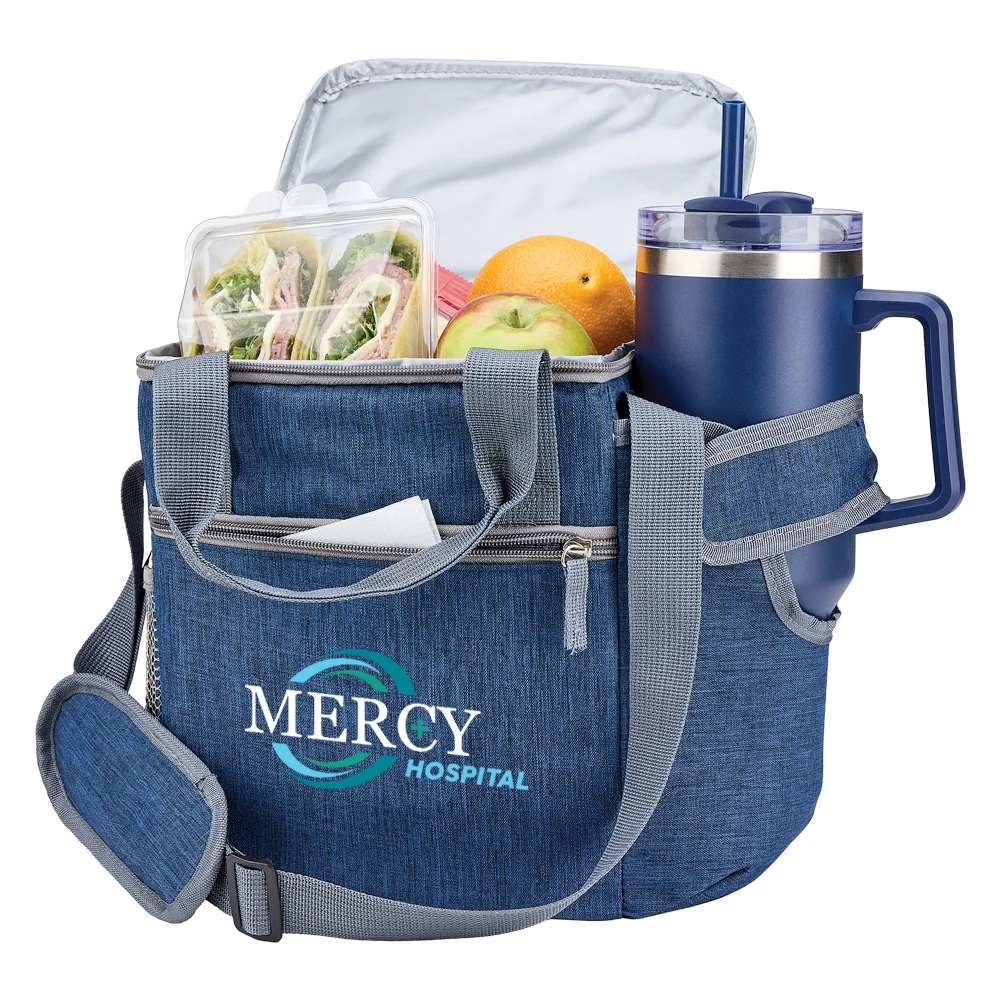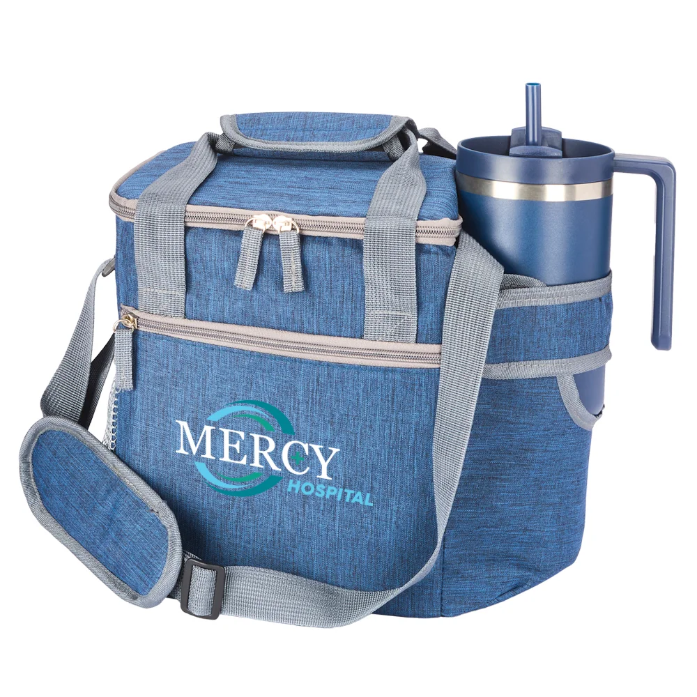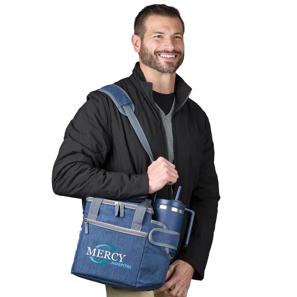 Personalized Lunch/Cooler Bag: Dual-zip, insulated main compartment keeps contents colder (or warmer) longer; Mesh pocket inside lid; Front zip pocket stashes napkins and other items; Side mesh pocket for a water bottle, utensils, and more; Additional adjustable side pocket totes up to a 30-/40-oz. bottle or tumbler; Two carry options: comfort-wrapped handles or padded, adjustable shoulder strap; Holds up to 9 cans; ID window on back; Heathered 600-denier polyester