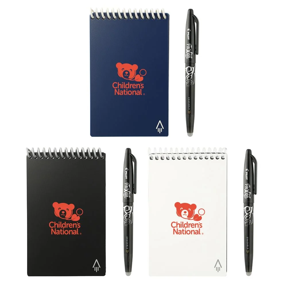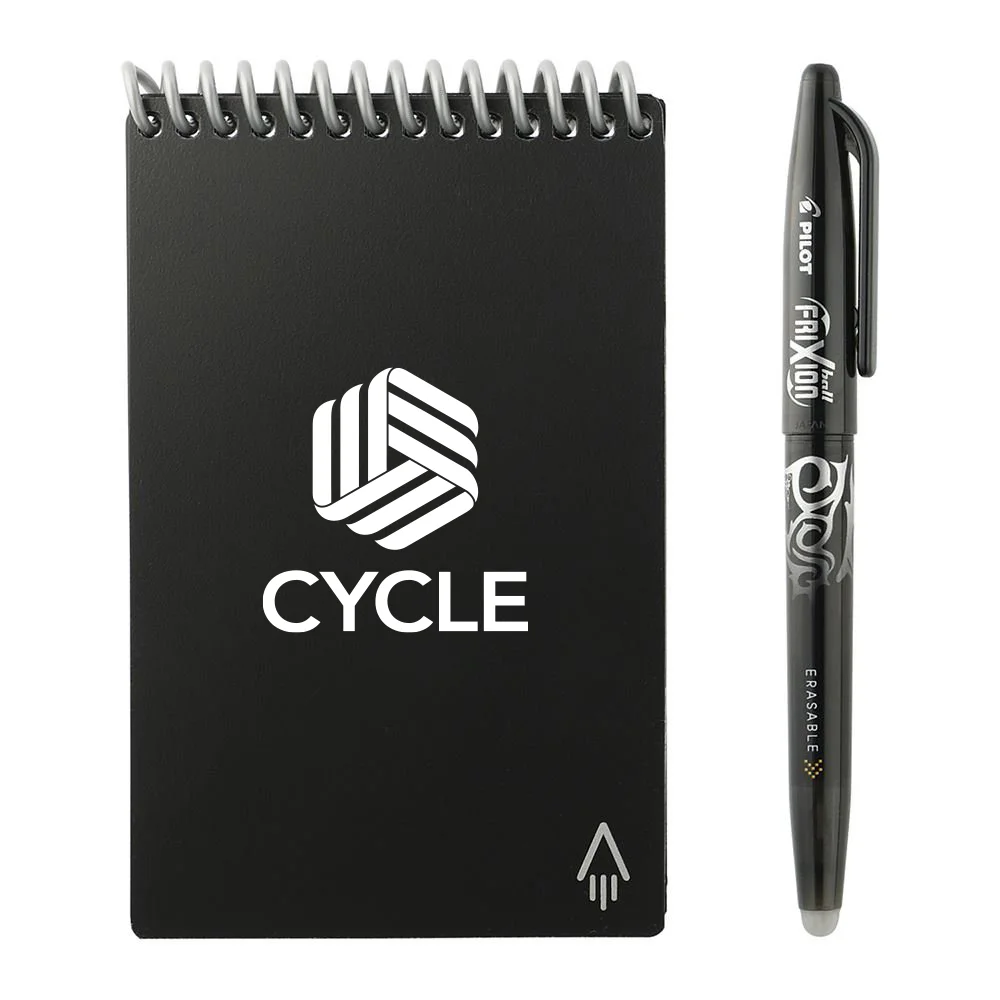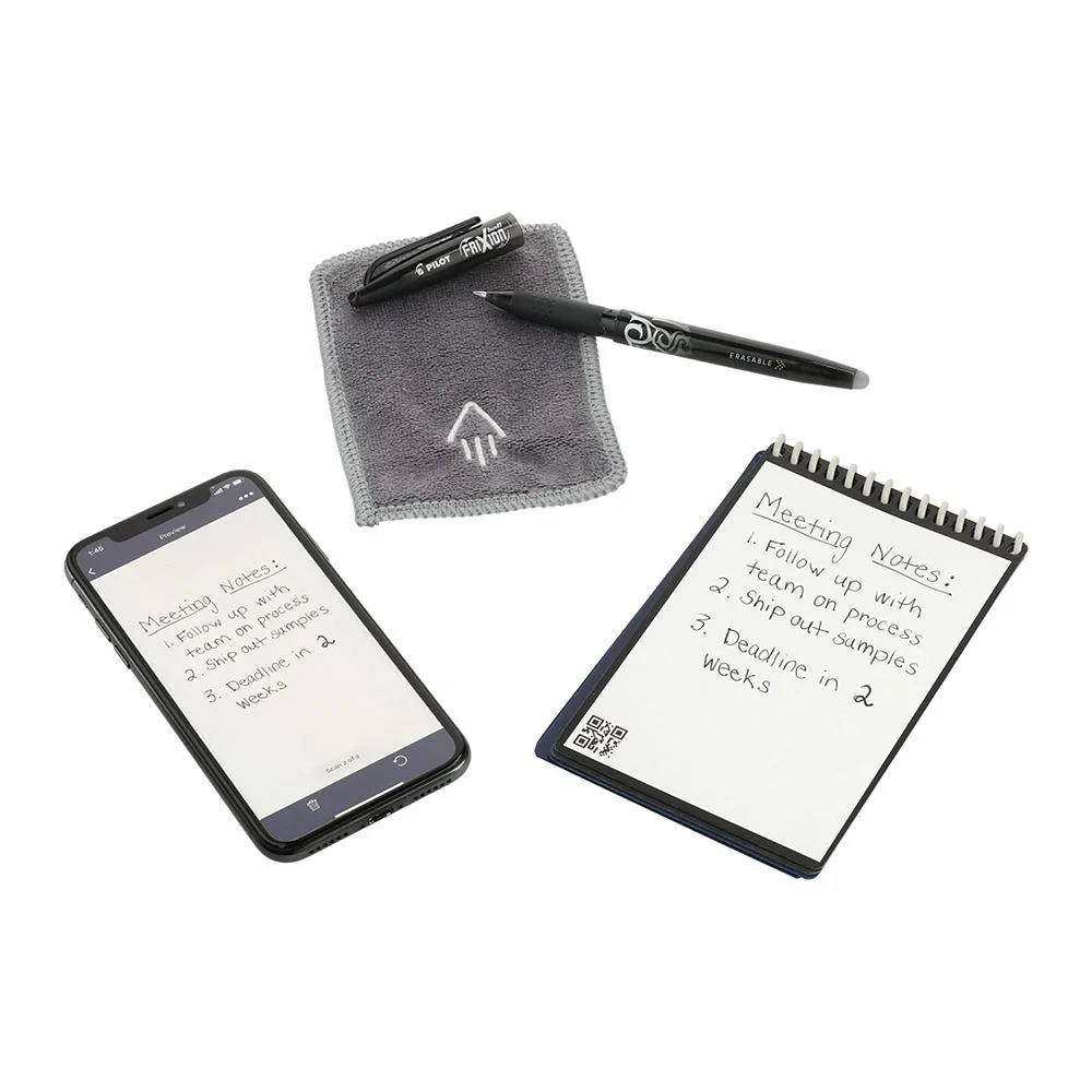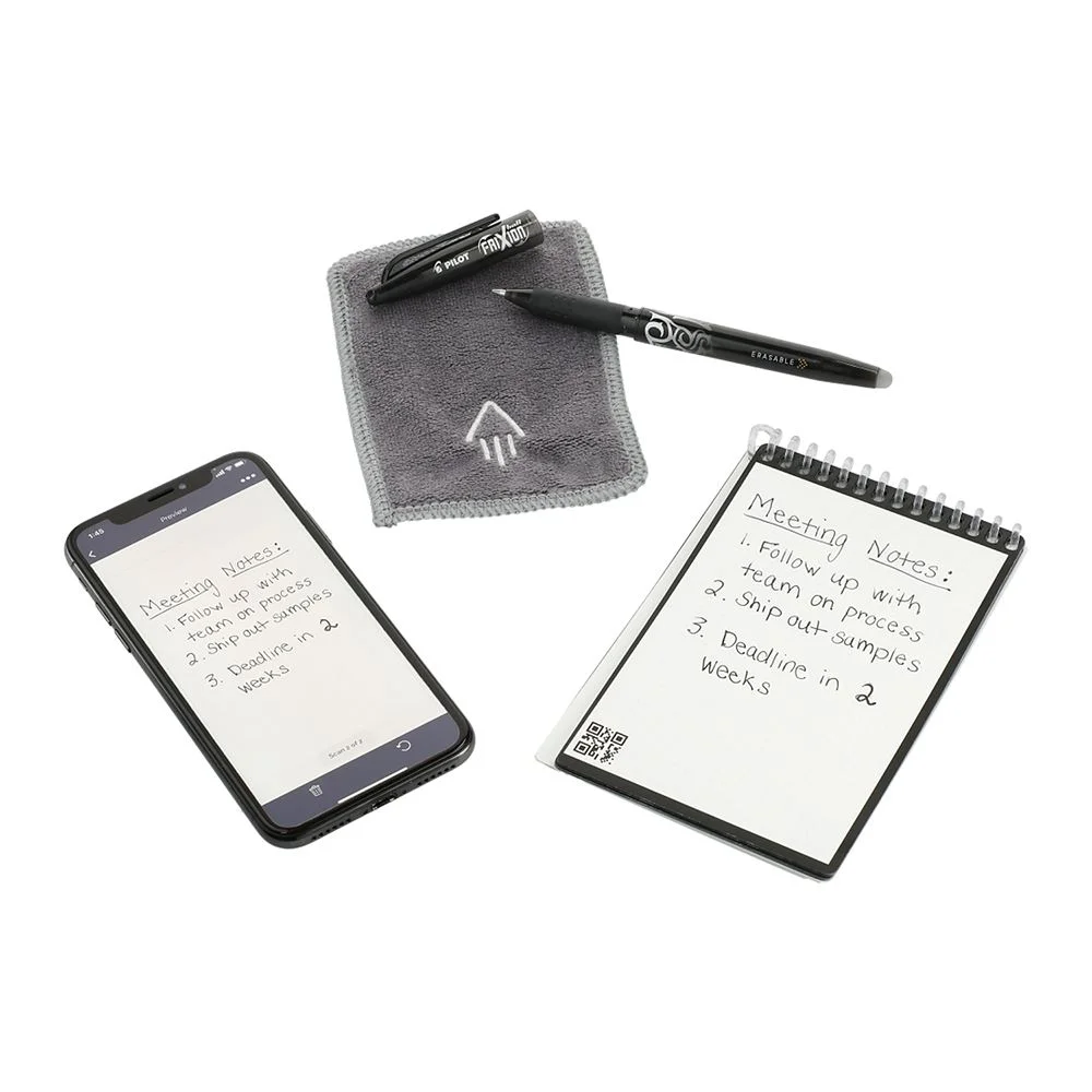 Rocketbook® Mini Notebook: Designed for every classroom, office, and personal mission; Hard polypropylene cover; 48 pages of synthetic dotted paper allows you to write smoothly with a Pilot® Frixion pen; Magically wipes clean with a damp cloth to reuse again and again; Eco-friendly alternative to regular paper; Use the Rocketbook app to save your notes to your favorite cloud service for proper organization