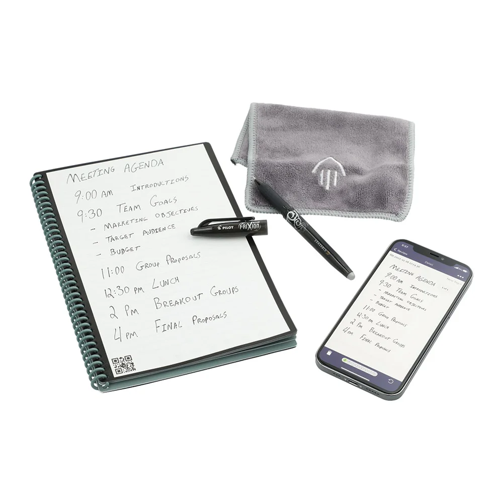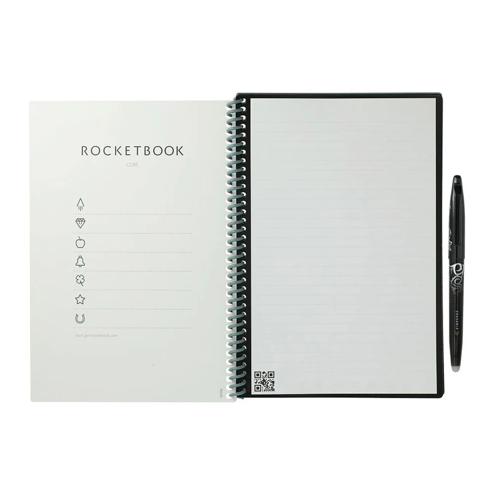 Notebook: Designed for every classroom, office, and personal mission; Features an exclusive recycled polypropylene cover; Synthetic pages made with patented reusable Core technology; Allows you to write smoothly with a Pilot Frixion pen; Magically wipes clean with a damp cloth to reuse again and again; Eco-friendly alternative to regular paper; Use the Rocketbook® app to save your notes to your favorite cloud service for proper organization; Then, erase and reuse for your next adventure
