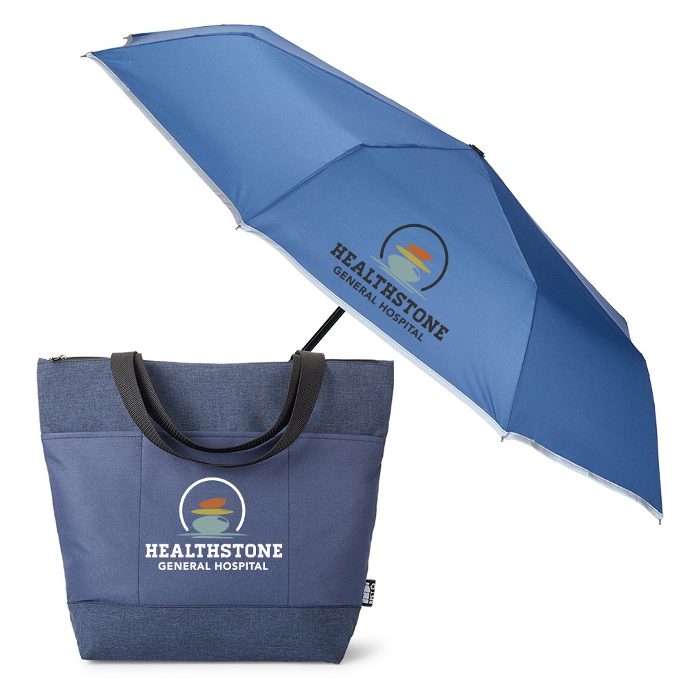 2-piece gift set includes: Laguna rPET Water-Resistant 17" Computer/Laptop Tote Bag With Trolley Strap & 42" Auto-Open/Auto-Close Compact Umbrella With Reflective Trim
